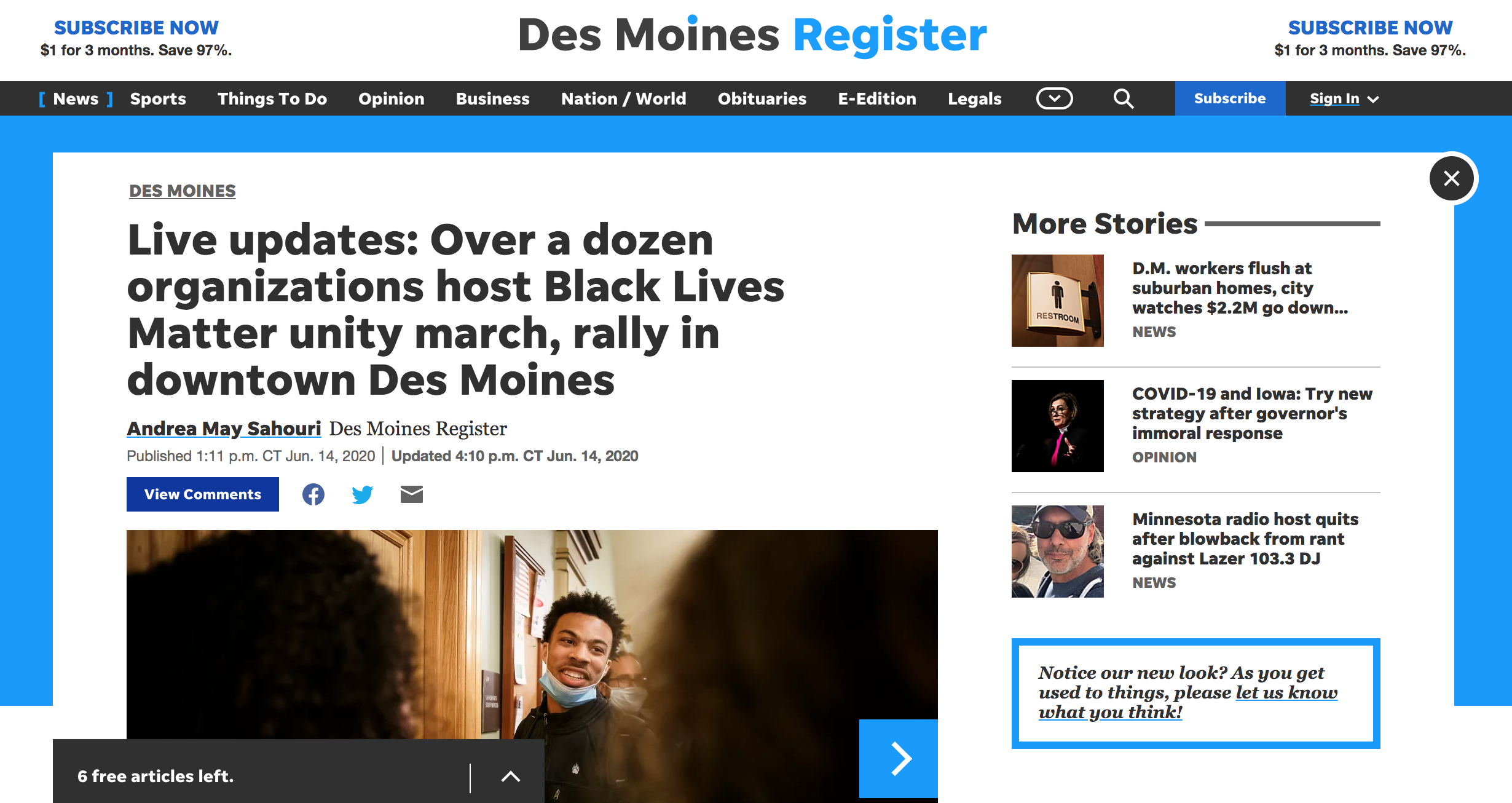 I live in Des Moines, Iowa. We were hosts to many different protests. Many people wanted to keep things peaceful. This article talks about what happened.