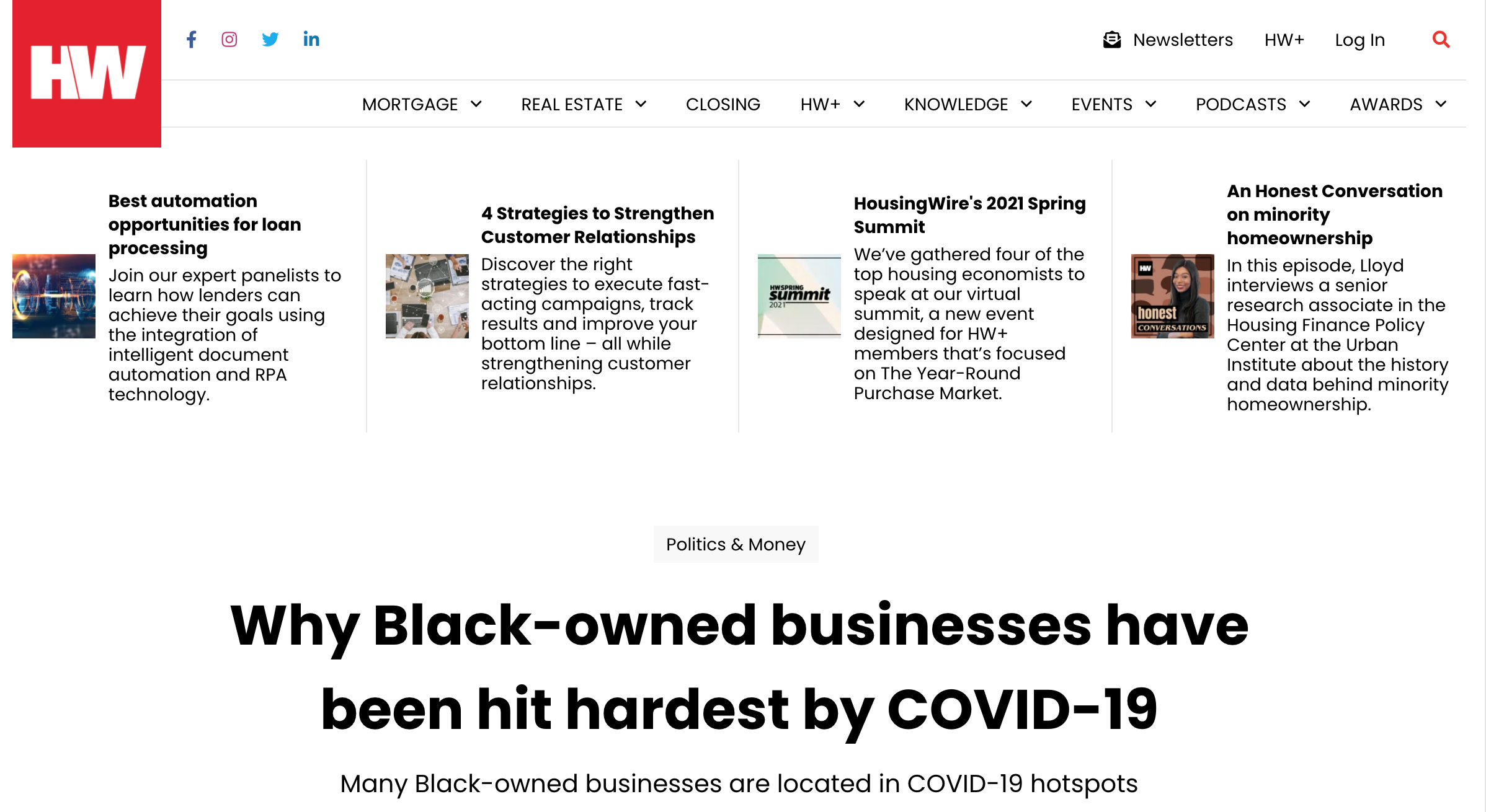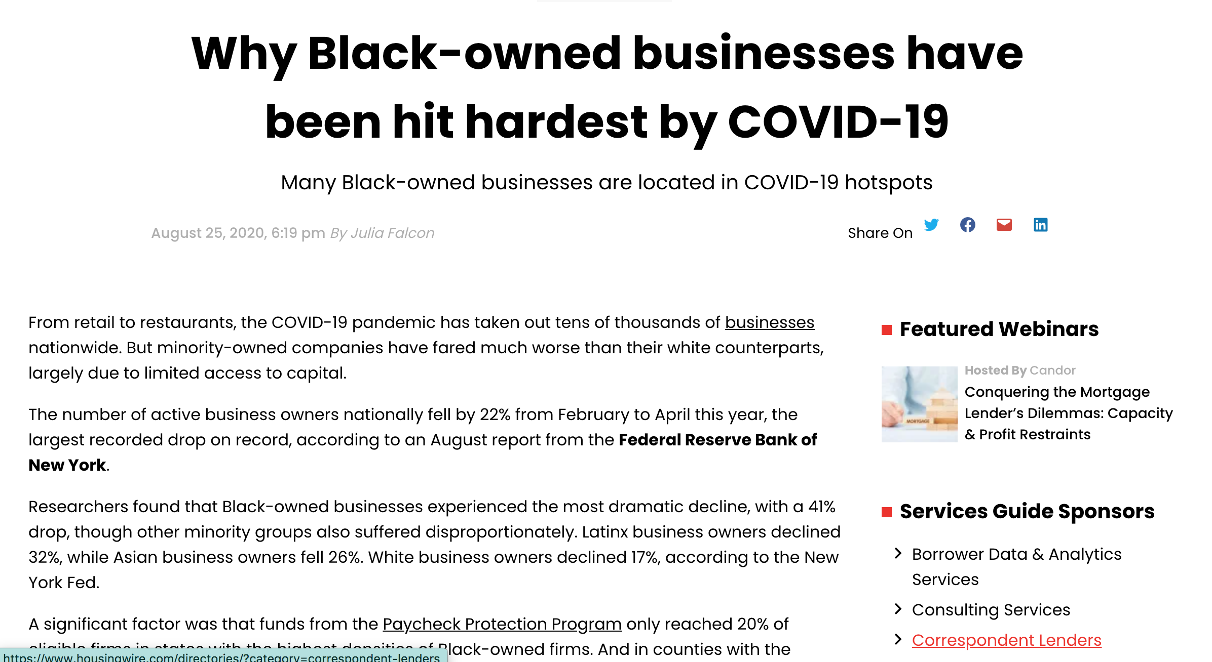 Black restaurant owners and other Black business owners have been hit harder than their white counterparts during COVID-19. This article details the why of this occurrence, including lack of access to assistance, and the disproportionate effect of COVID-19 on Black communities compared to others.