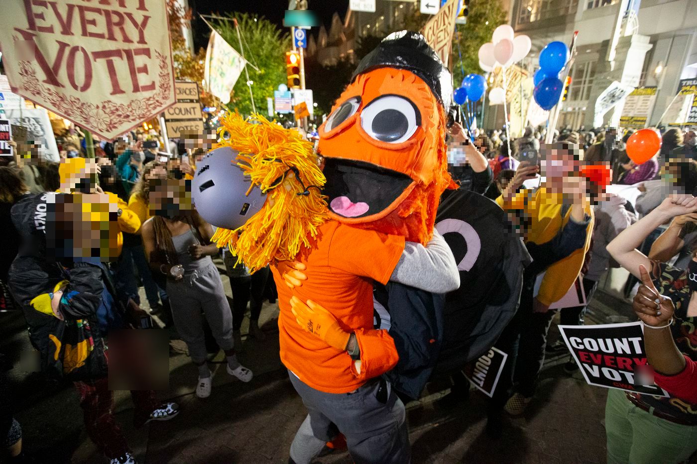 Two Biden supporters in Gritty costumes greet each other in Center City