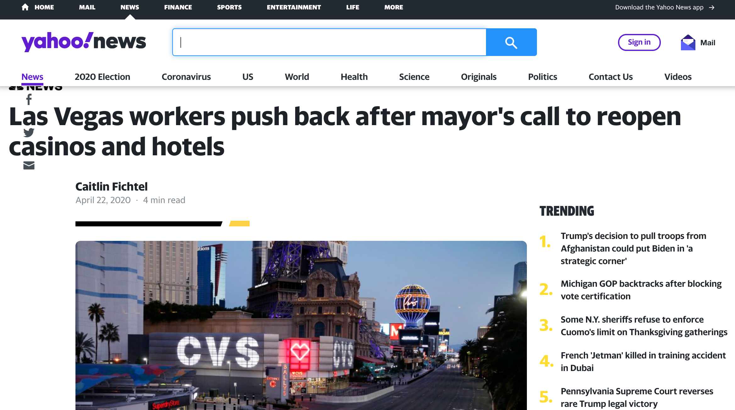 Fichtel, C. (2020, April 22). Las Vegas workers push back after mayor's call to reopen casinos and hotels. Retrieved November 07, 2020, from https://news.yahoo.com/las-vegas-workers-push-back-022132572.html?guccounter=1