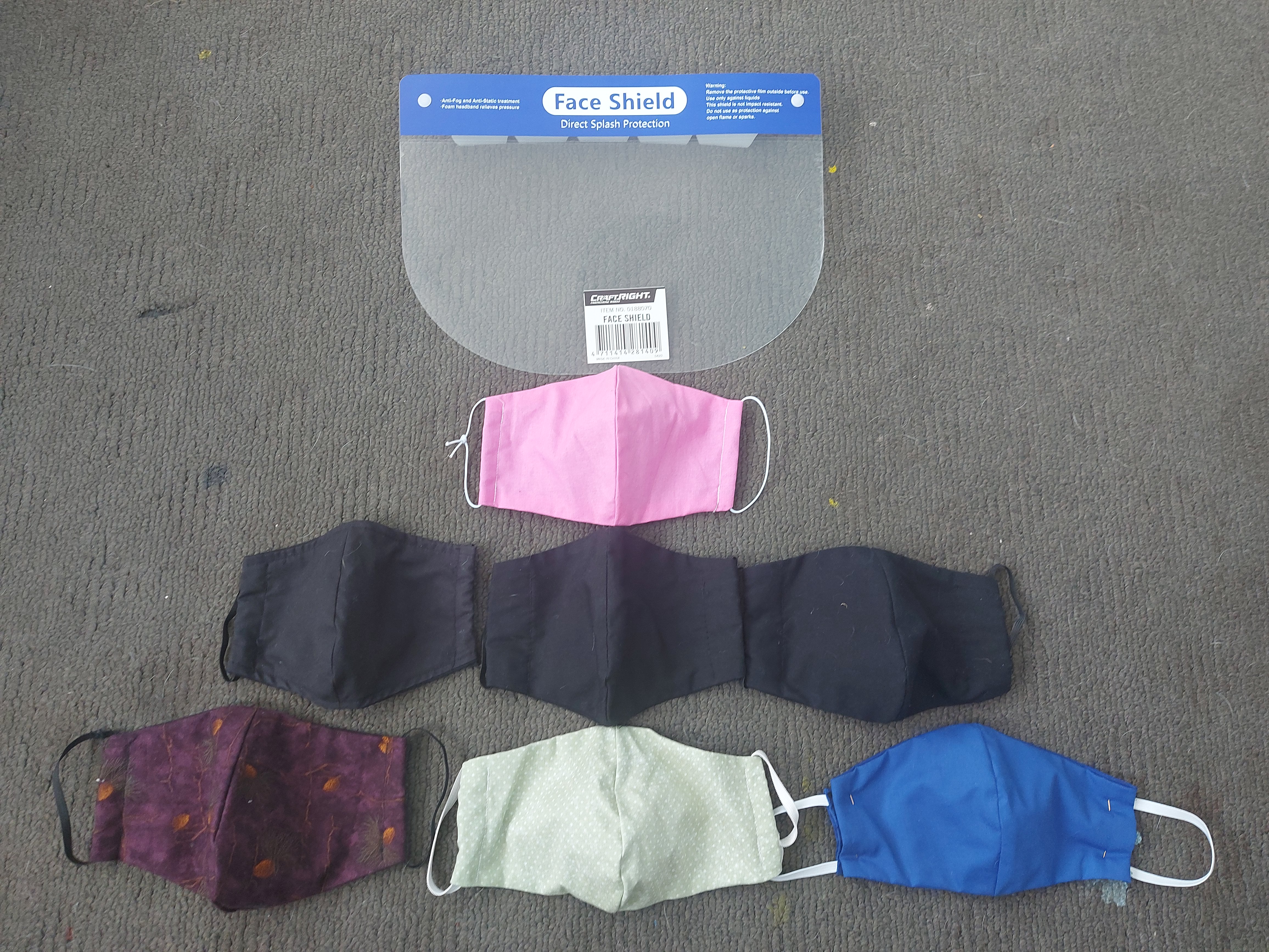A photograph of masks and one face shield laid out on the floor.