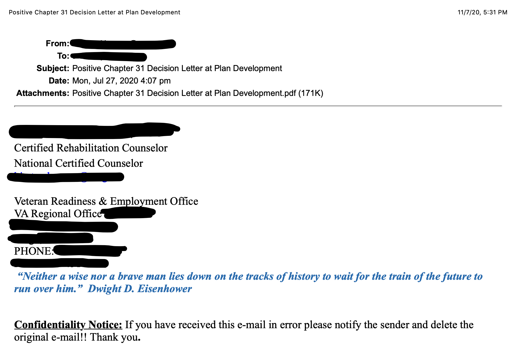 Upon receiving this letter, I was overwhelmed with joy and excitement. 30 years in the military sacrificing time with family, friends, and myself have offered me an opportunity to complete and extend my education. Something that I have always wanted to accomplish but could not because of career choices and defending our country. The attachment to this email is the “Decision Letter” that explains the criteria of how the VA has determined my grant into the Department of Veterans Affairs Education Benefits. It was great news receiving this letter, but receiving it comes after my summer registration and start of class.