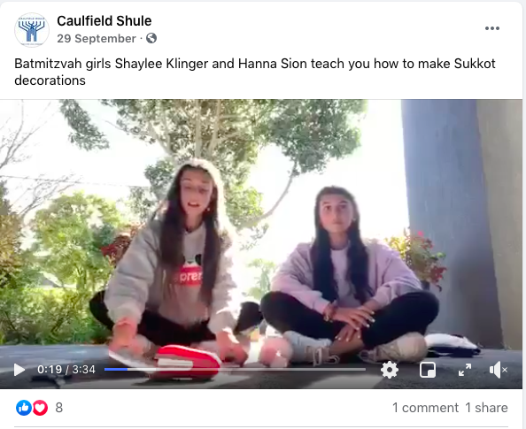 A video as part of the online programming for Sukkot from Caulfield Shule: "Batmitzvah girls Shaylee Klinger and Hanna Sion teach you how to make Sukkot decorations"