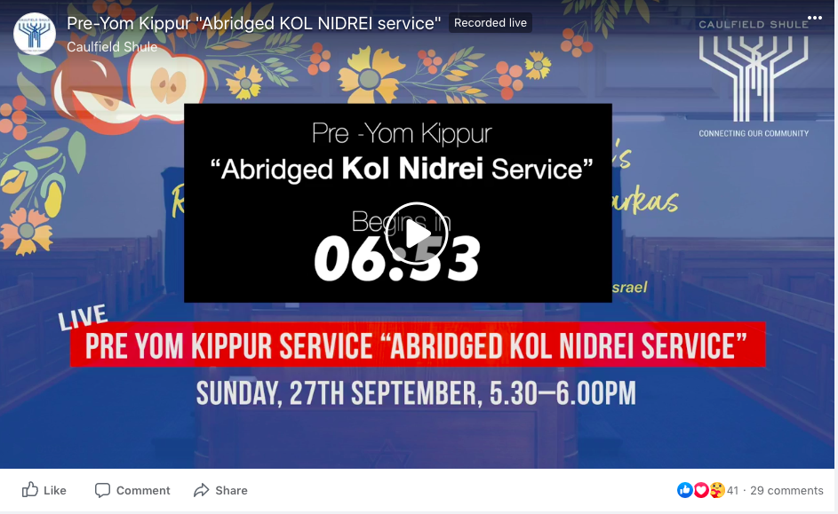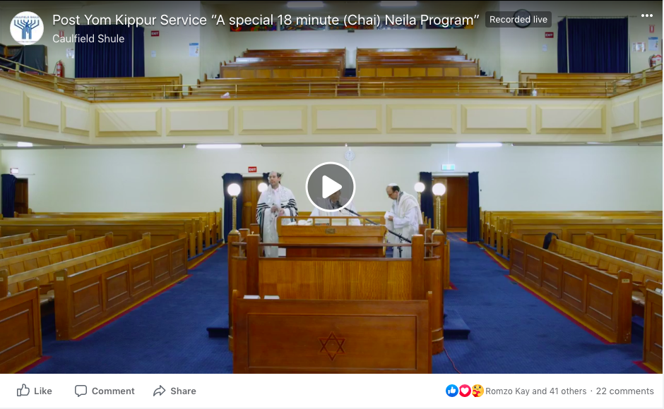 Due to the lockdown, Caulfield Shule was unable to have a Yom Kippur service. Instead, they pre-recorded abridged Kol Nidre and Yizkor services, and livestreamed an abridged Neilah service after Yom Kippur had ended.