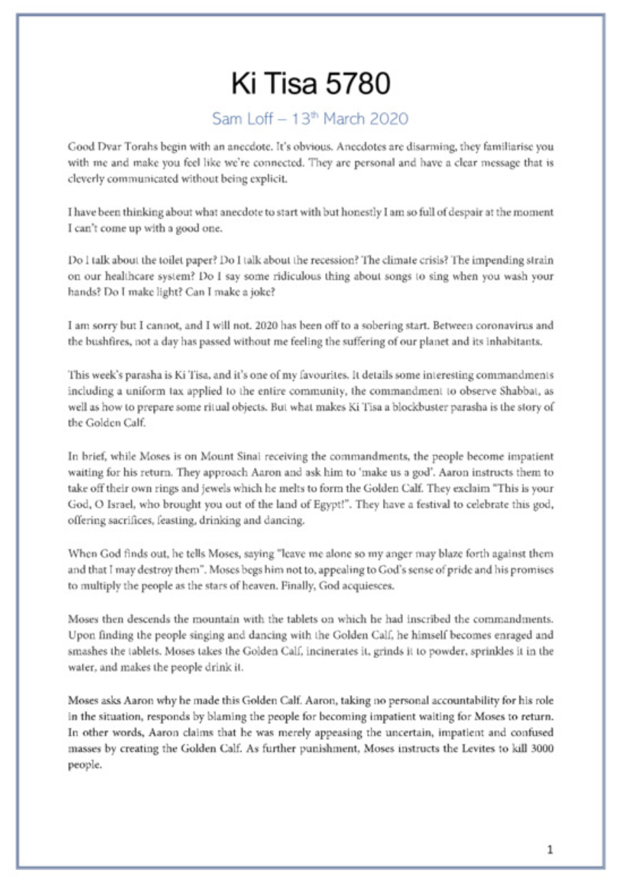 At the beginning of Victoria's lockdown in March, Sam Loff delivered a drash for parshat Ki Tisa