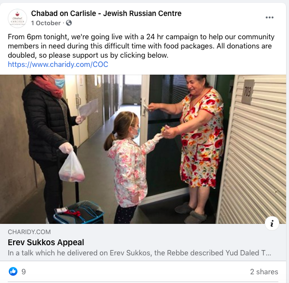 Chabad on Carlisle - Jewish Russian Centre organised a fundraiser for Sukkos: "In a talk which he delivered on Erev Sukkos, the Rebbe described Yud Daled Tishrei as a day when Jews should literally splurge in giving tzedoka. This year, the call for generosity is so much greater due to the impact of Covid, and the funds you donate will be distributed to alleviate financial hardship and enable the celebration of Succos with true joy and peace of mind."