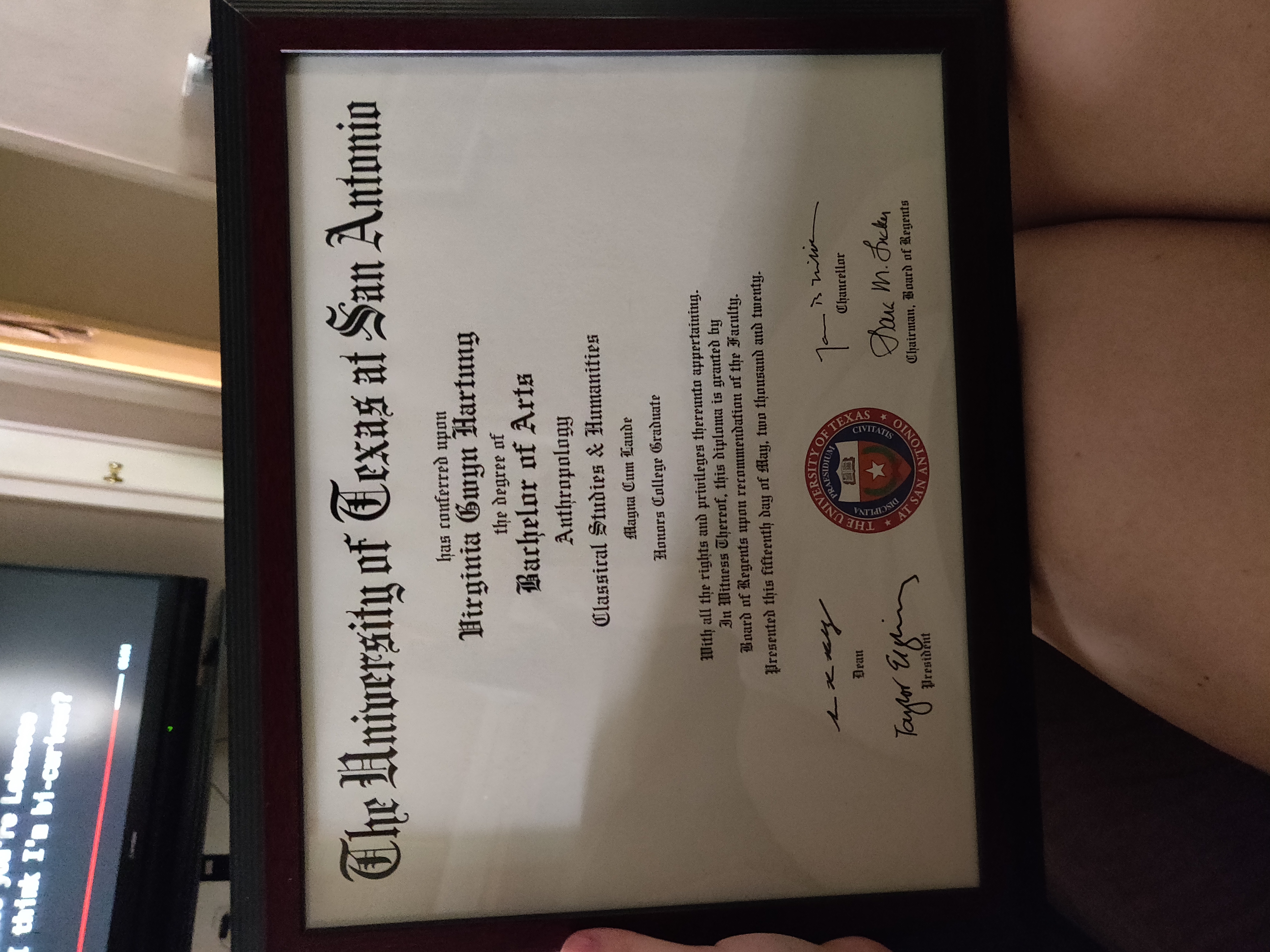 That's why I have my undergraduate degree on the wall right by my desk. If I get to feeling bad about myself, feeling afraid to be proud of myself, I look at my diploma and realize that I have done things a younger me wouldn't have dreamed of. It's okay if you aren't the smartest person in the world. You're allowed to feel proud of yourself, I hope that this reminder helps me when I need it most.