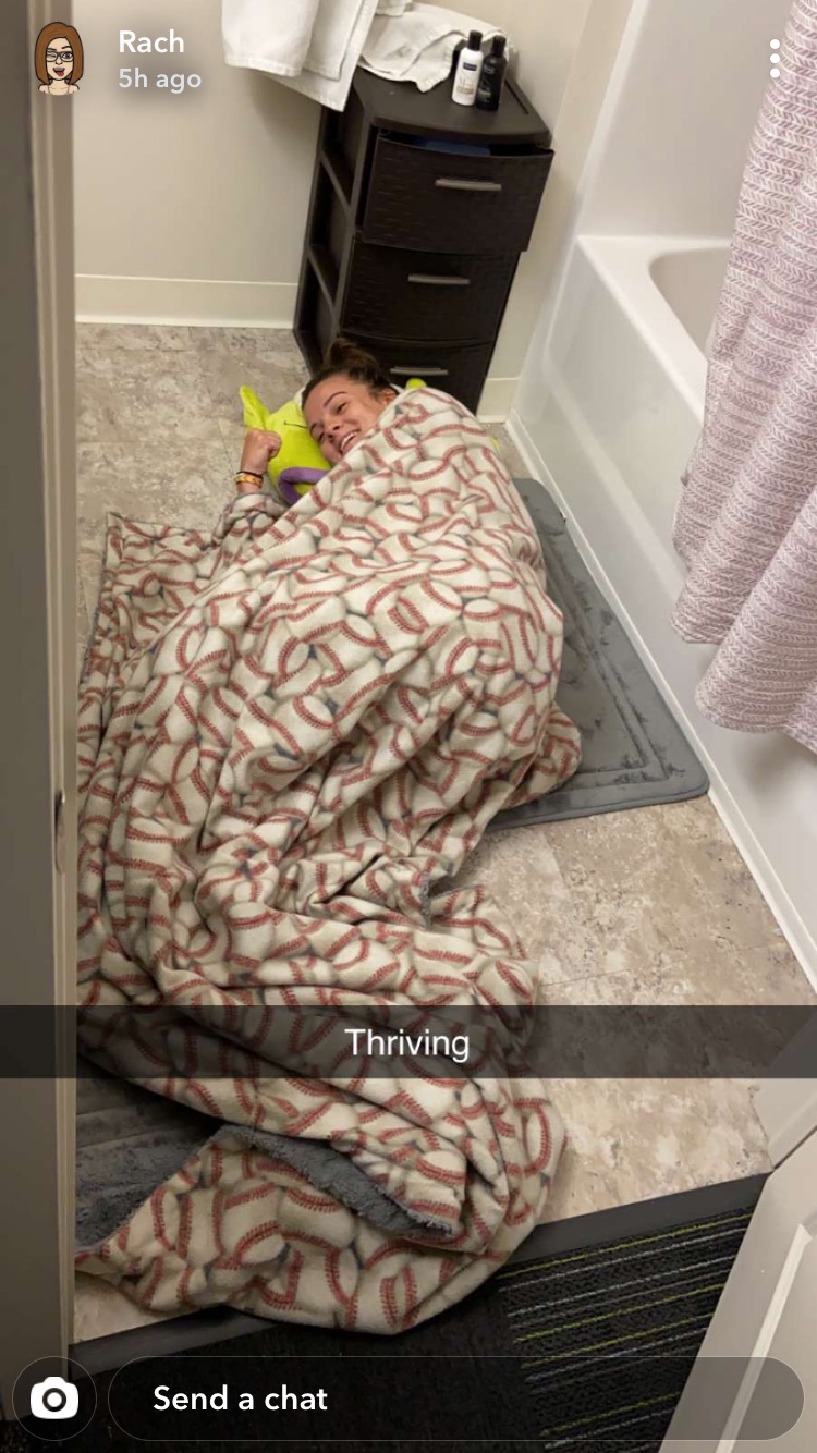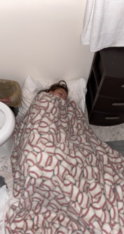 It shows that COVID is real and that it is serious. My roommate was infected with the virus and she got really sick. In the picture she was on the bathroom floor and this is because she was very nauseous and if she wasn't in the bathroom, the whole apartment would've been a mess. We checked up on her constantly to ensure she was okay and we would cook for her. She had to quarantine in her room for 2 weeks since she moved in before us so we didn't have to quarantine as long as her but it was still not a fun time. She is seen smiling in the picture but that is just because we tried to lift up her spirits so she wasn't miserable the entire illness.