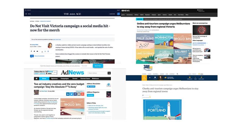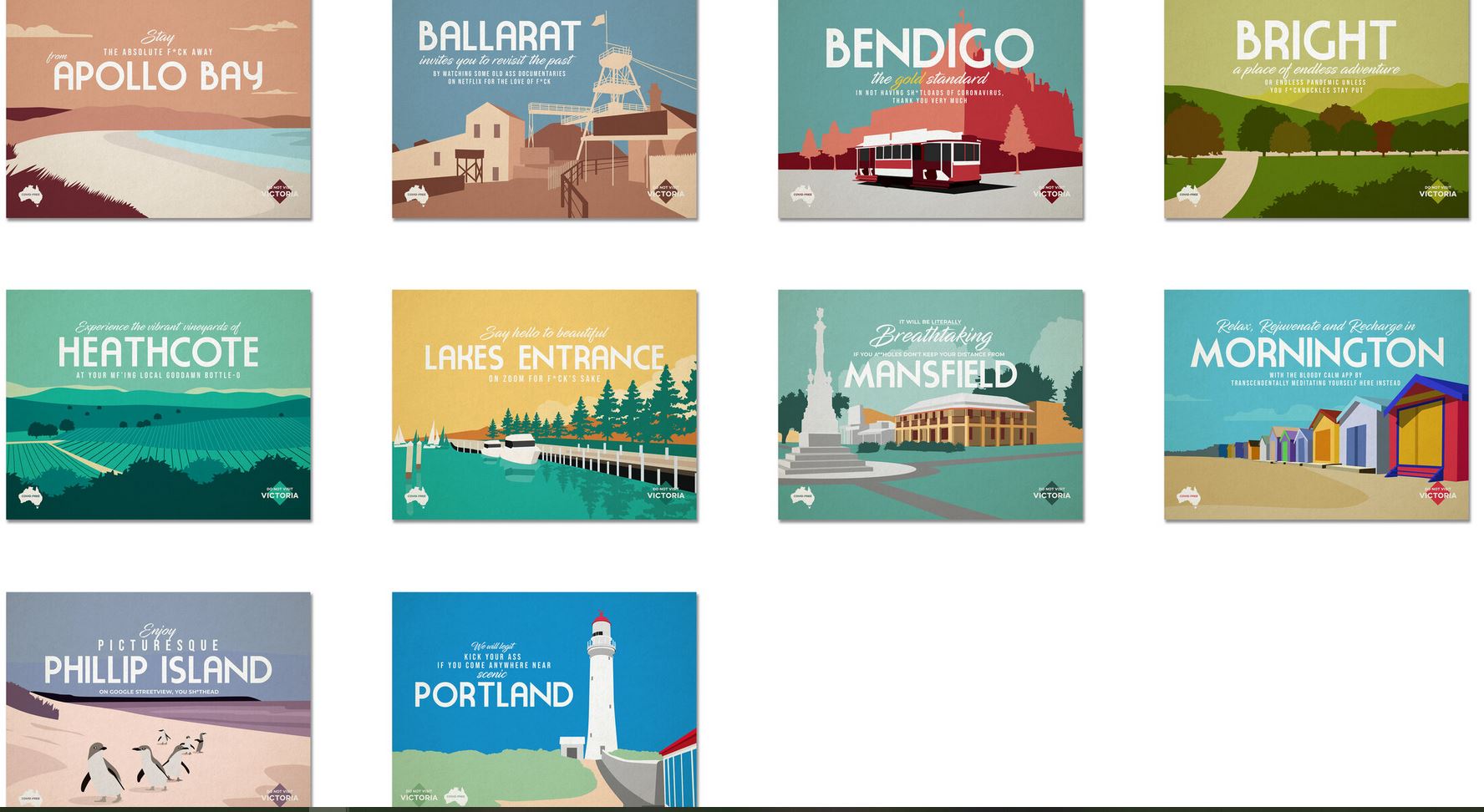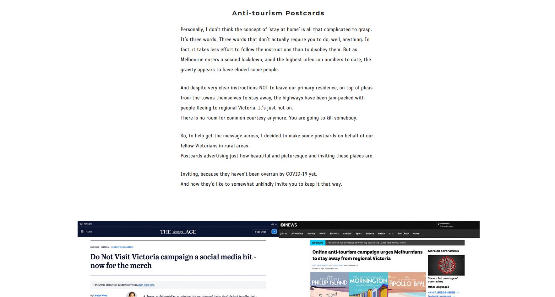 This is a screenshot of anti-tourism postcards that were published when Melbourne went back into stage 3 lockdown. Their purpose was to deter Melbournians from travelling to regional Victoria. I selected this source as I believed this campaign was promoting the wrong behaviour of which we should all treat each other. During COVID, being caring, kind and empathetic to one another is needed in order to get through each day, and I felt these postcards were seeking to do the opposite of what we needed.