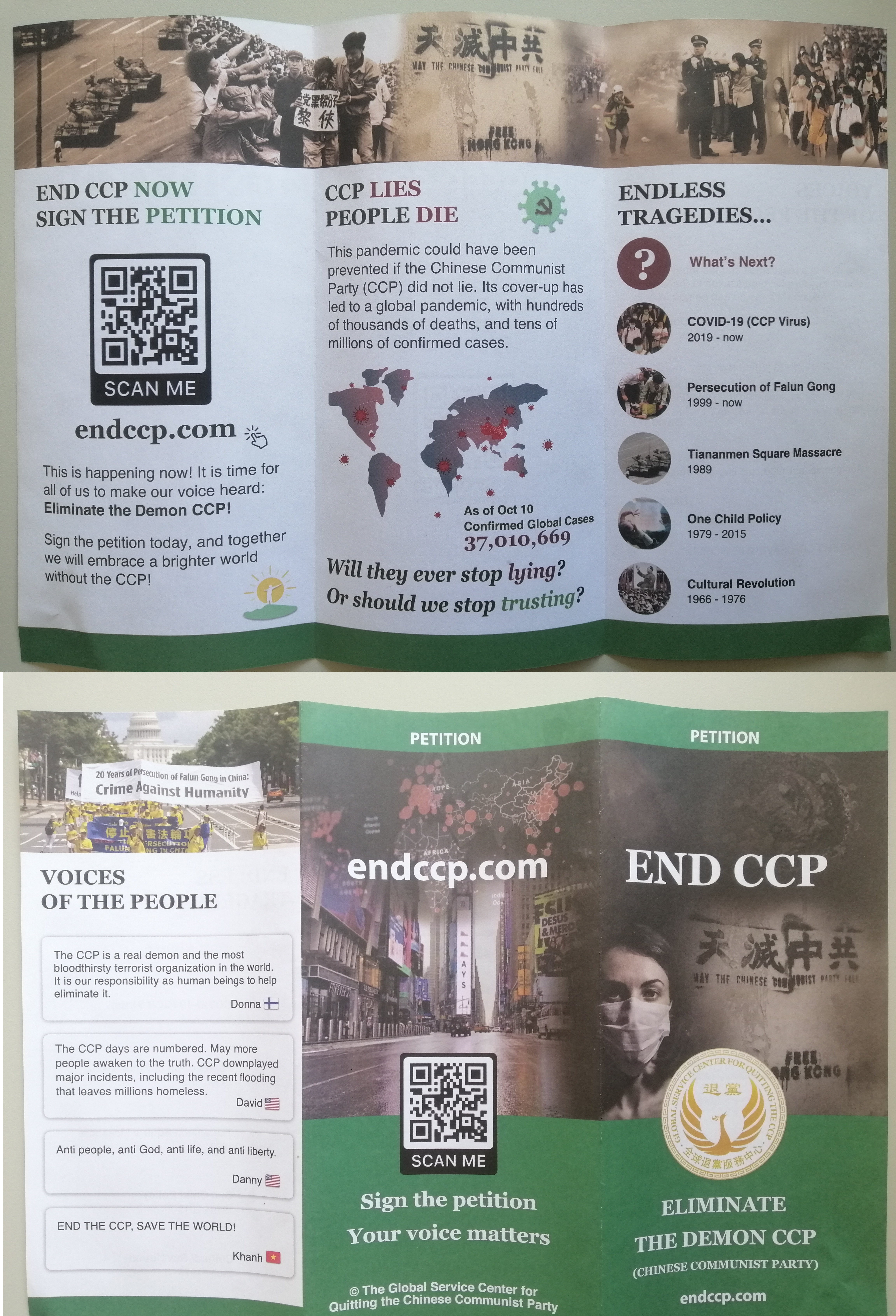 This is a pamphlet I got in my mailbox from the Global Service Centre for Ending the Chinese Communist Party, inside which describes many of the 'evils' of the CCP including malicious negligence in the spread of COVID-19. It was quite unusual for me to receive this in my mailbox, I'm assuming since it was not a posted letter it was simply dropped off to many houses in my neighbourhood. The writing in it is quite sensationalistic, and was clearly extremely critical of the Chinese Communist Party. A lot of information and misinformation has been spread regarding the origins and handling of COVID-19, and much of it relies on fear and distrust to propagate.