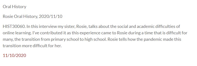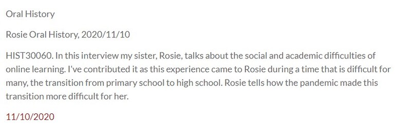 HIST30060. In this interview my sister, Rosie, talks about the social and academic difficulties of online learning. I've contributed it as this experience came to Rosie during a time that is difficult for many, the transition from primary school to high school. Rosie tells how the pandemic made this transition more difficult for her.