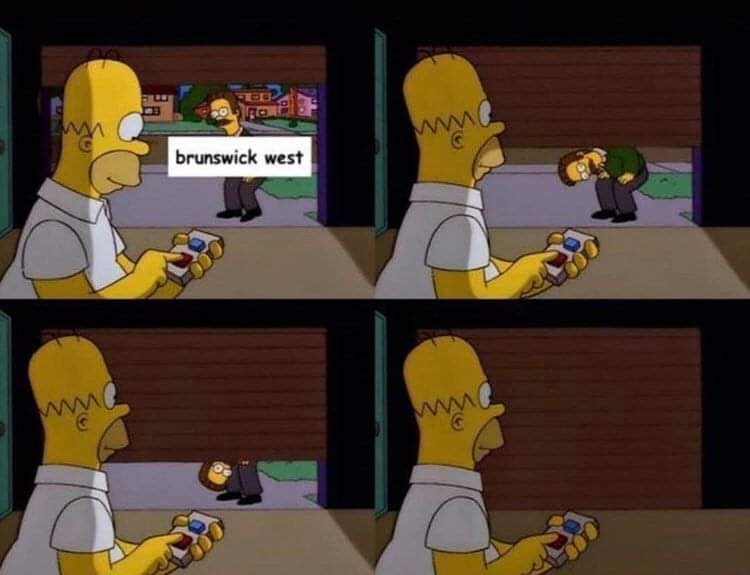 This meme was posted in my Melbourne friends' Facebook Messenger group chat in the wake of Victorian Premier Daniel Andrews' announcement that certain 'hotspot' suburbs in Melbourne would return to Stage 3 lockdown at the end of June 2020. From the point of view of people outside of hotspot suburbs, it makes light of other neighbouring suburbs turning a blind eye to people who have to go back to lockdown, creating temporary walls between spaces, people and families. Unfortunately, because I lived in Brunswick West, I was one of the unlucky few in my friendship group who had to go back into lockdown. I watched on social media as all my other friends caught up with each other and took advantage of being able to travel more and go out to bars and cafes. As unlucky as I felt, memes like this one always functioned as a way to laugh at bad situations. My friends and I usually coped with lockdown through memes and jokes, characteristic of gen Z humour.