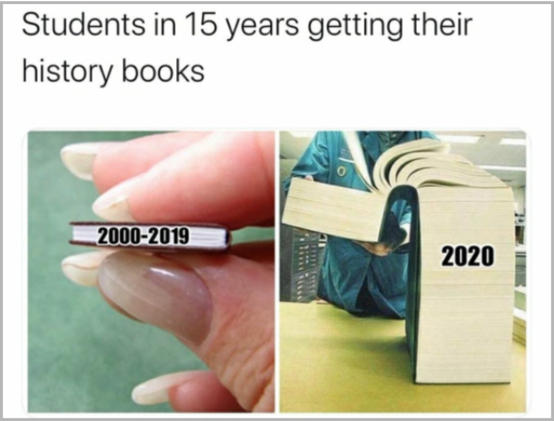 HIST30060 - submitted as part of an assessment for a history subject. A significant number of the memes I found commented on the incredible number of ‘disasters’ or disruptions that have had a global impact this year (suggesting that this number is far more than anything to occur in the last decade). The disasters referenced in these memes concern a range of instances including the Australian Bushfires, the “threat of World War III” (with the assassination of Iranian General Qasem Soleimani by drone strike), the Covid-19 pandemic, the American Murder Hornets, the explosion in Beirut and the American bushfires. The ‘disasters’ or global events that feature in the memes span almost every continent and every sphere from environmental (e.g. the bushfires), the social (e.g. the American race riots), the economic, the political (e.g. the explosion in Beirut and subsequent investigation into corruption) and health (e.g. the pandemic). This particular meme suggests that the study of this year will be an arduous task for history students of the future.