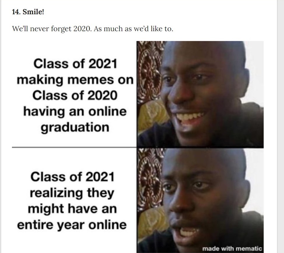 I, like many people my age, find not only humor but relatability in memes. They take the stress of issues that are exacerbated by the pandemic and help make us chuckle at it. I picked these three after looking at many, many others, because I related to them quite a bit.