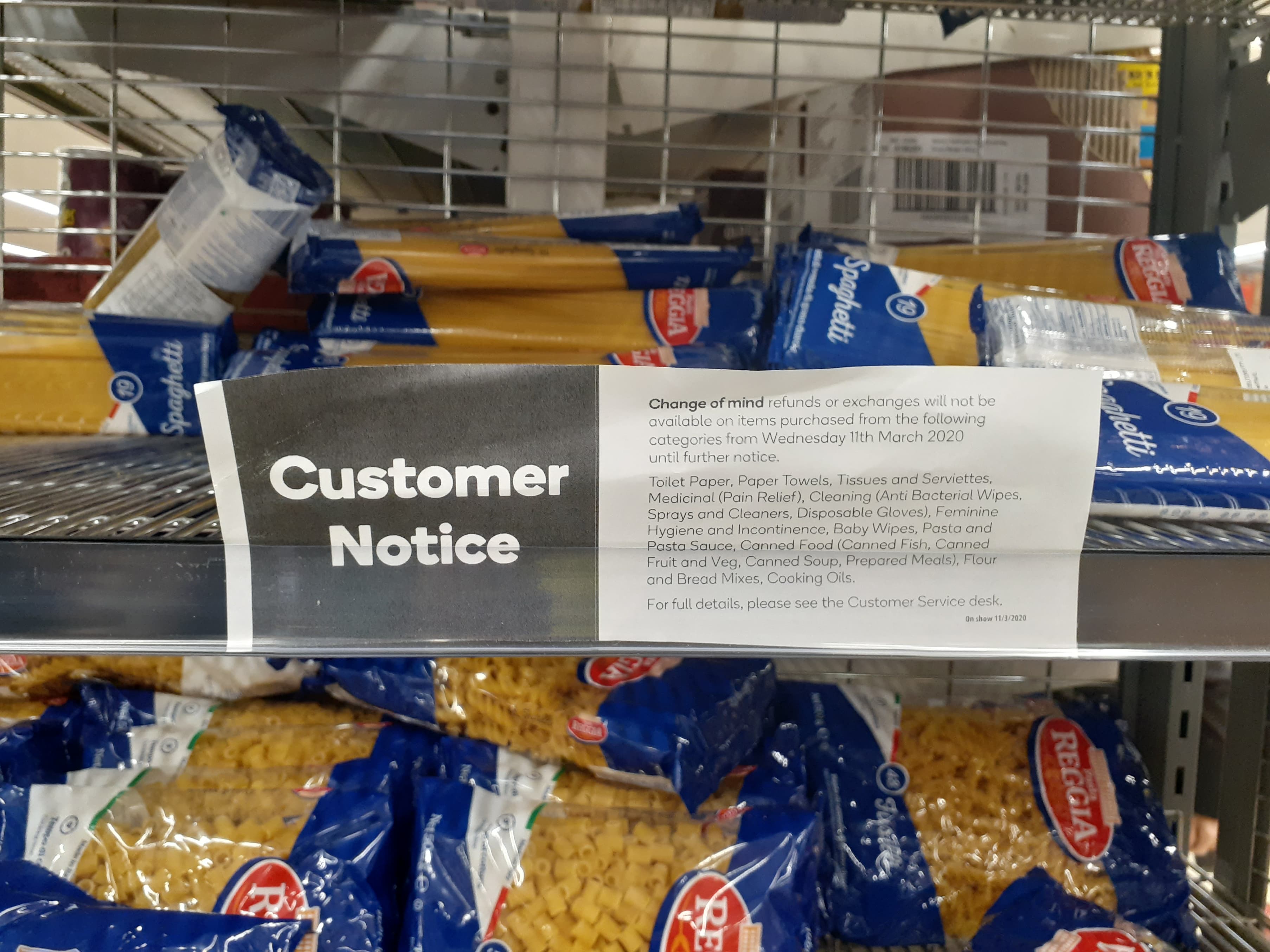 HIST30060: A ‘Customer Notice’ at Woolworths in mid-March, explaining their new returns policy alongside a list of affected products. With half the shelves bare due to ‘panic buying’, grocery stores implemented new rules to avoid having to give refunds to people who changed their mind. I took this photo at a suburban Woolworths, packed with frantic shoppers and overflowing carts.