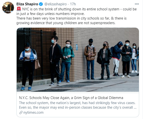 The school system, the nation’s largest, has had strikingly few coronavirus cases. Even so, the mayor may end in-person classes because the city’s overall rate is surging.