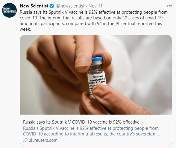 Following initial findings of Pfizer's vaccine being effective in preventing COVID-19 infection in more than 90% of people, Russia says its vaccine has 92% efficacy according to preliminary findings in stage three of the clinical trials. The trial results are based on 20 confirmed COVID-19 cases.
