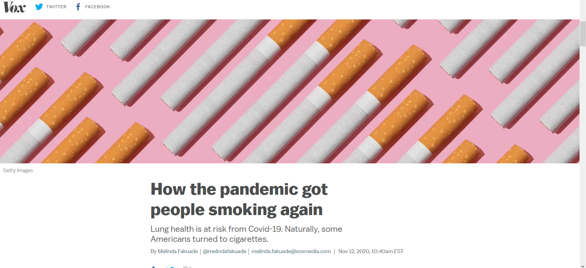 With the advent of the COVID-19 pandemic, many people have been pressured to develop bad habits such as overeating, alcoholism, doom scrolling, and impulse shopping. But one pandemic indulgence that stands out to medical officials and journalists is smoking, which damages lungs and puts one at an increased risk from dying of COVID-19. In an article for Vox, journalist Melinda Fakuade provides readers with an overview of the reasons why more people have taken up smoking during the COVID-19 pandemic in spite of the increased risk of death.