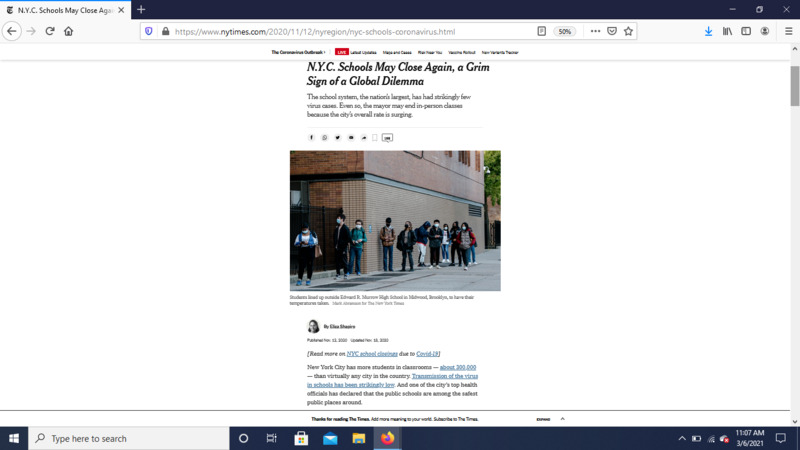 NYC Mayor Bill DeBlasio is contemplating whether or not to shut down schools in the city again. Ironically schools would be shut down but bars and restaurants might stay open despite the very low transmission rate in public schools. Other cities have begun canceling in-person classes such a Boston. Other countries such as Germany deemed schools an essential service and has left them open. There is much concern among NYC teachers as they weigh the costs of a total shift to online school again.