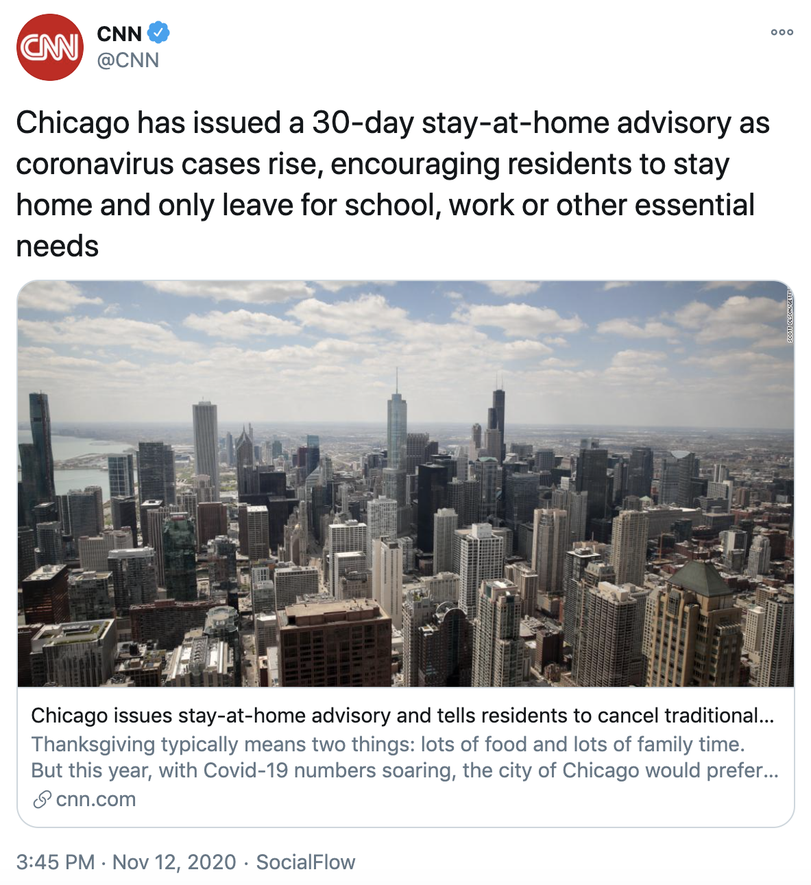 As cases are rapidly rising in the United States many cities are imposing more restrictions again such a closing down certain public spaces and services. Chicago recently issued a 30 day stay at home advisory and New York Governor Andrew Cuomo is floating the idea of imposing more restrictions if the high transmission rate continues. Officials are telling people to cancel any Thanksgiving plans people might have as a result of the rising cases all over the country.