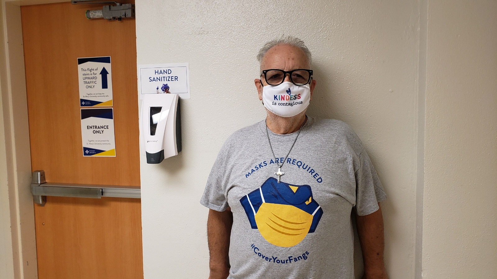 This is a picture of me in Charles Francis Hall at St. Mary's University, where I'm a student. One of the things which is happening here is the Fang Squad, which encourages social distancing and the wearing of masks. I'm modeling the teeshirt I was lucky enough to get. It's important to me because both myself and people I care about are members of the higher risk group.
