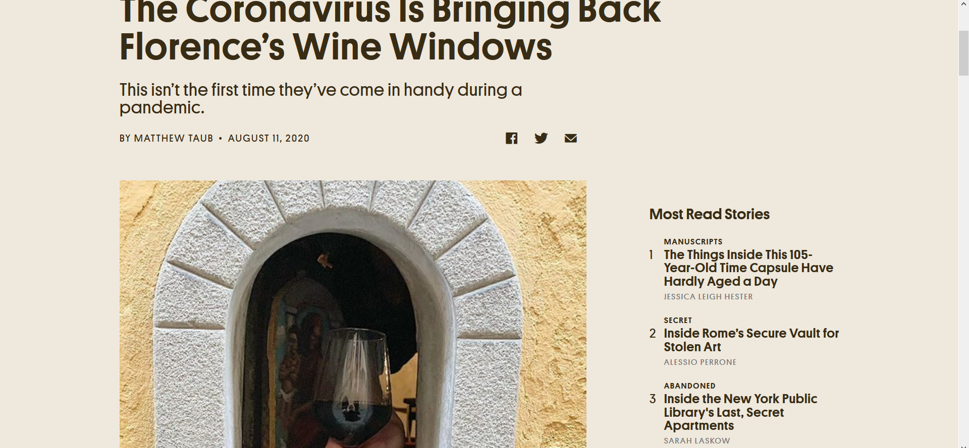 The COVID-19 pandemic, aside from encouraging people to take up new hobbies, has encouraged people to look to the past for methods of dealing with the risks of the pandemic. In an article for Atlas Obscura, journalist Matthew Taub looks at how the people of Florence, Italy, have dealt with the new reality of COVID-19 by using a medieval innovation: wine windows.