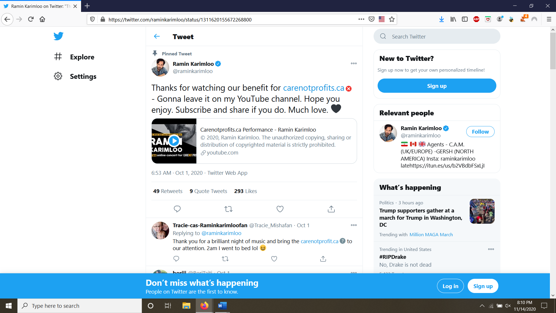 On October 1, 2020, Ramin Karimloo, who starred in several musicals on West End, held a livestreamed concert on his Youtube channel to help raise money for healthcare workers. The charity he featured was Care Not Profit, a Canadian-based charity lobbying for living wages for people who work in for-profit long-term care facilities, better conditions for residents of those facilities, and better benefits for the workers.