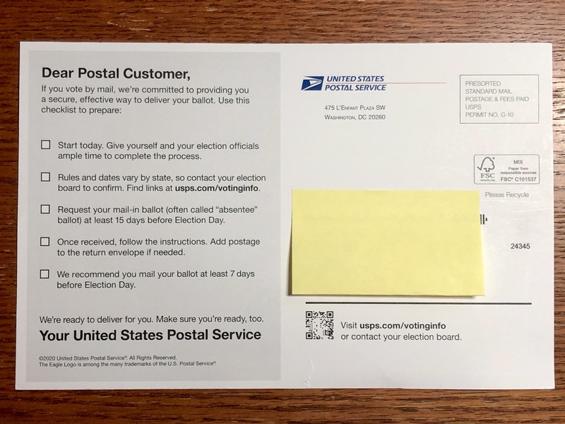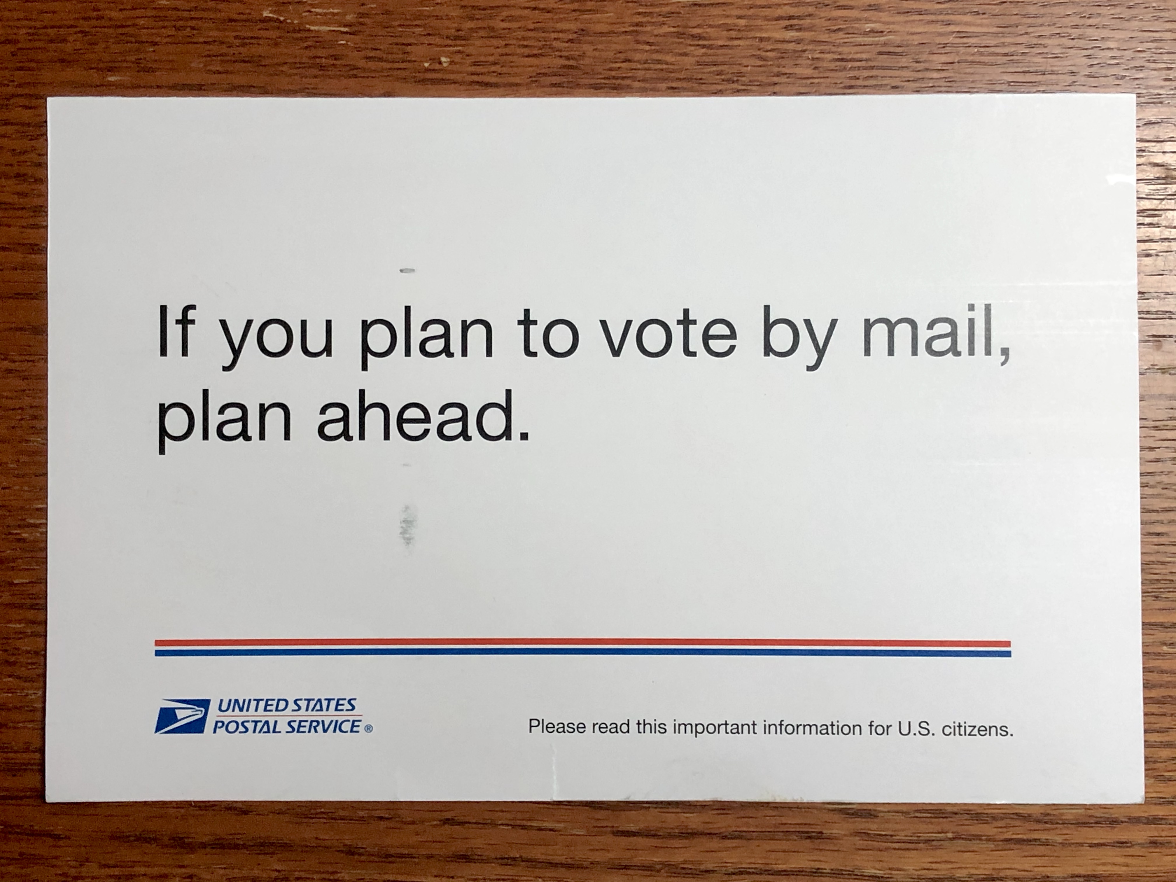 On September 15, 2020 I received a post card mailer from the U.S. Postal Service. The message is: "If you plan to vote by mail, plan ahead." The reverse side had my information and a note detailing a list of suggestions to prepare for mailing in a ballot during the 2020 U.S. Election. Personally, I've voted in many elections over the past few decades and voted by mail for a long time before this election as well - I've never received any information like this. You can tell that during the pandemic there was going to be a lot of pressure on voting by mail. Personally, I turned in my ballot at least a month before the actual day in fear that the postal system would be overwhelmed in the days right before the election. This is the first year where voting by mail didn't seem like a convenience, but felt like it was a large part of election history. The pandemic seems to be shifting our daily lives in ways that no one would've expected at the beginning of 2020.