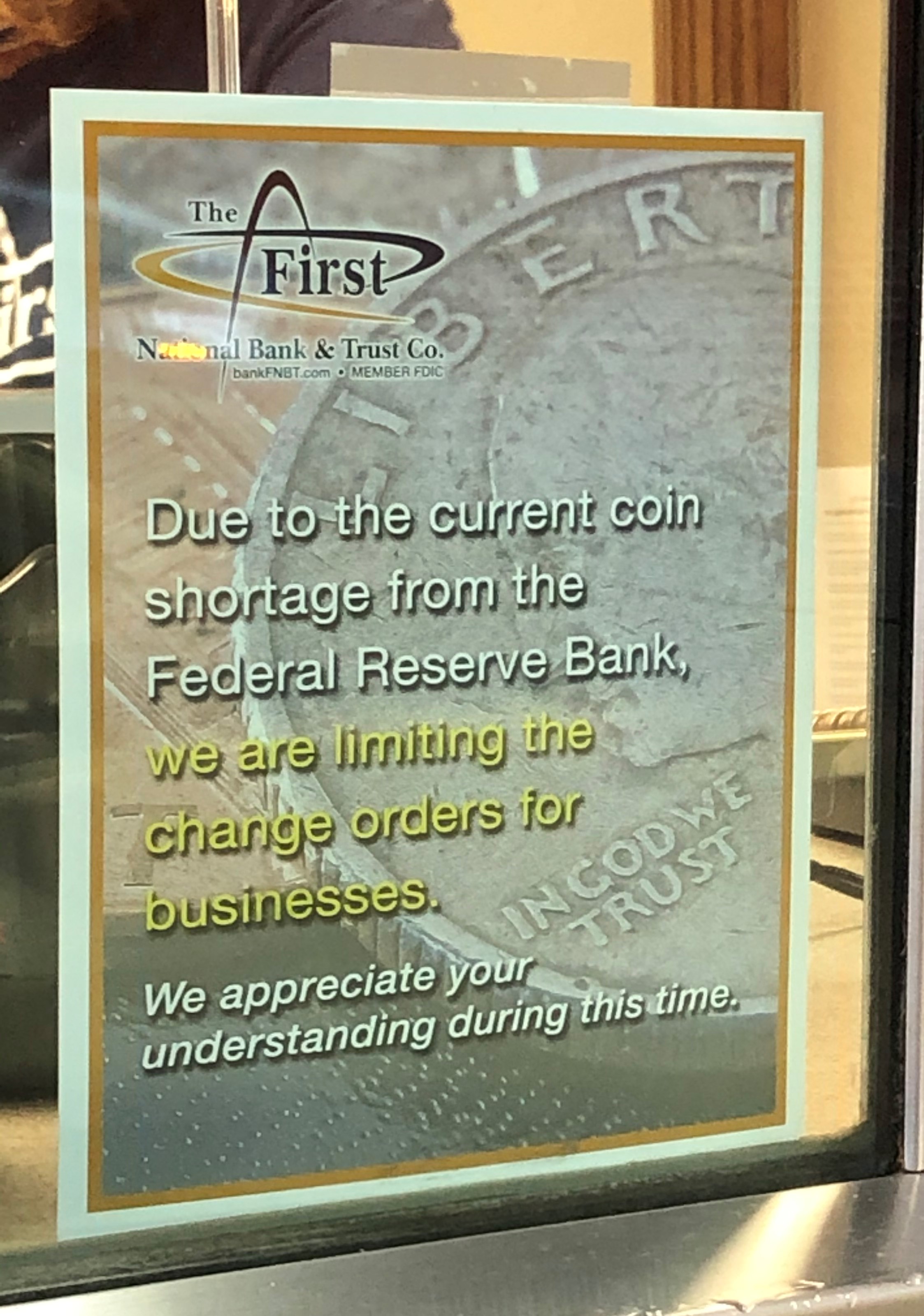 On July 10, 2020 the local bank had a sign displayed that warned of the coin shortage that was caused by the pandemic. Due to the shortage, local businesses were limited in the amount of coins they could request from the National Bank in Blanchard, Oklahoma. On July 24, 2020 we decided to do our part and cashed in all of our coins. This gave us some extra cash and gave the bank some extra rolls of coins to distribute to the local businesses. Signs at local fast food restaurants still display their signs on the coin shortage and occasionally cannot make exact change. For certain restaurants like Taco Bell, they were encouraging over the summer to donate the remaining change to a charity they would then distribute the money to. This is example of how the pandemic has changed our lives in unpredictable ways.