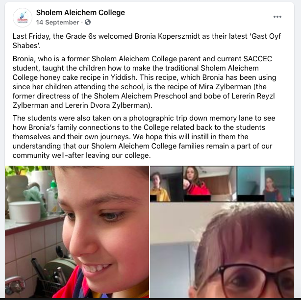 The students were also taken on a photographic trip down memory lane to see how Bronia’s family connections to the College related back to the students themselves and their own journeys. We hope this will instill in them the understanding that our Sholem Aleichem College families remain a part of our community well-after leaving our college."