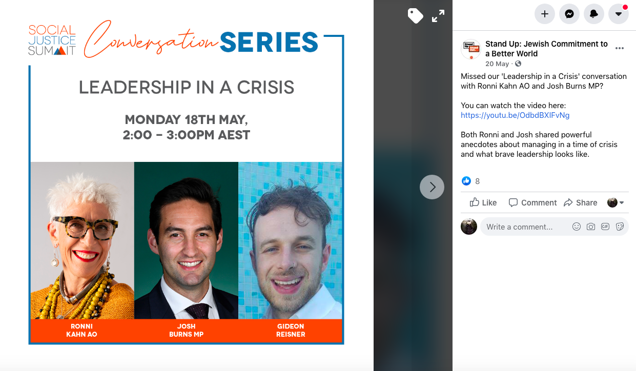 This post advertises a webinar that took place, providing a link to the recording on youtube, of a 'Leadership in a Crisis' conversation with Ronni Kahn AO and Josh Burns MP, facilitated by Stand Up CEO Gideon Reisner