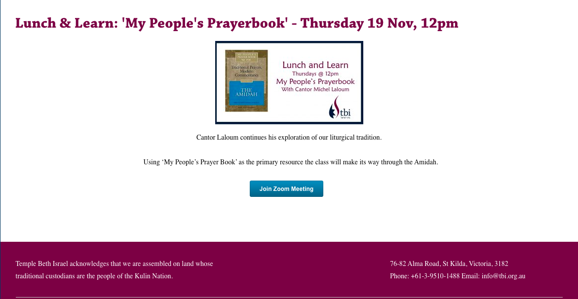 During the year, Cantor David Laloum at Temple Beth Israel hosted a Thursday Lunch and Learn on zoom, for people to learn Amidah together