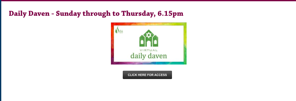 Sunday through Thursday, Temple Beth Israel hosts a 'virtual daily daven' online at 6.15pm.