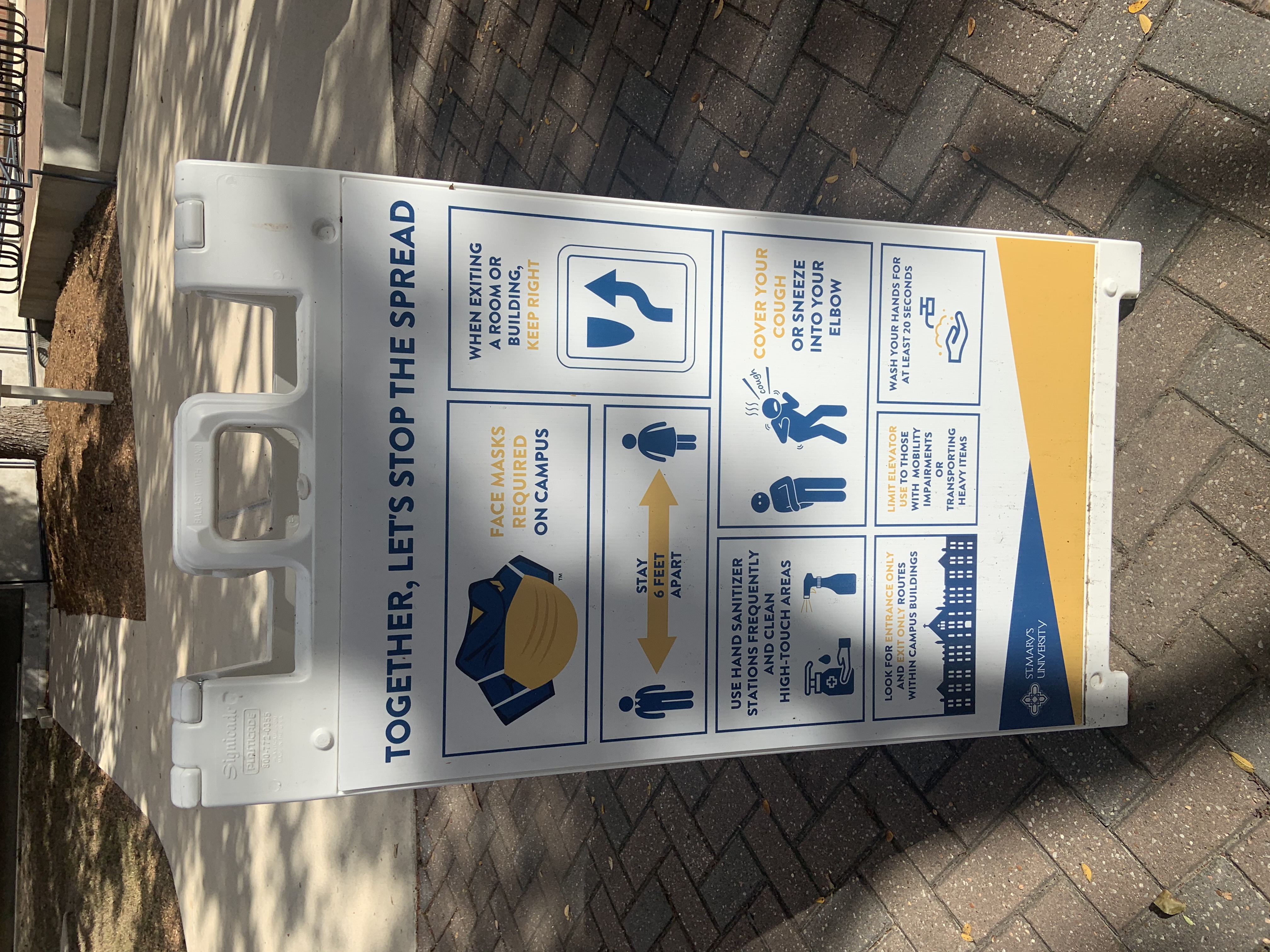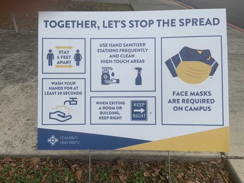 Together we can protect St. Mary's University! Signs like these are in place to remind students at St. Mary's University to remember the new COVID19 safety guidelines put in place to protect the university and the St. Mary's Community. The signs remind students to wear their masks, keep their social distance (about six feet), to wash their hands, to use hand sanitizing stations placed around campus for their health and safety, and to mind the direction they walk in public areas like dorm hallways or large public spaces.