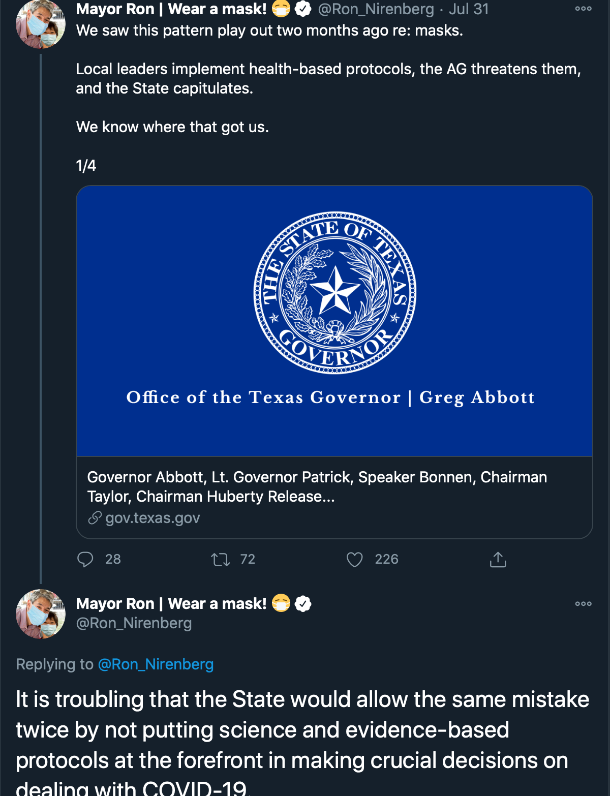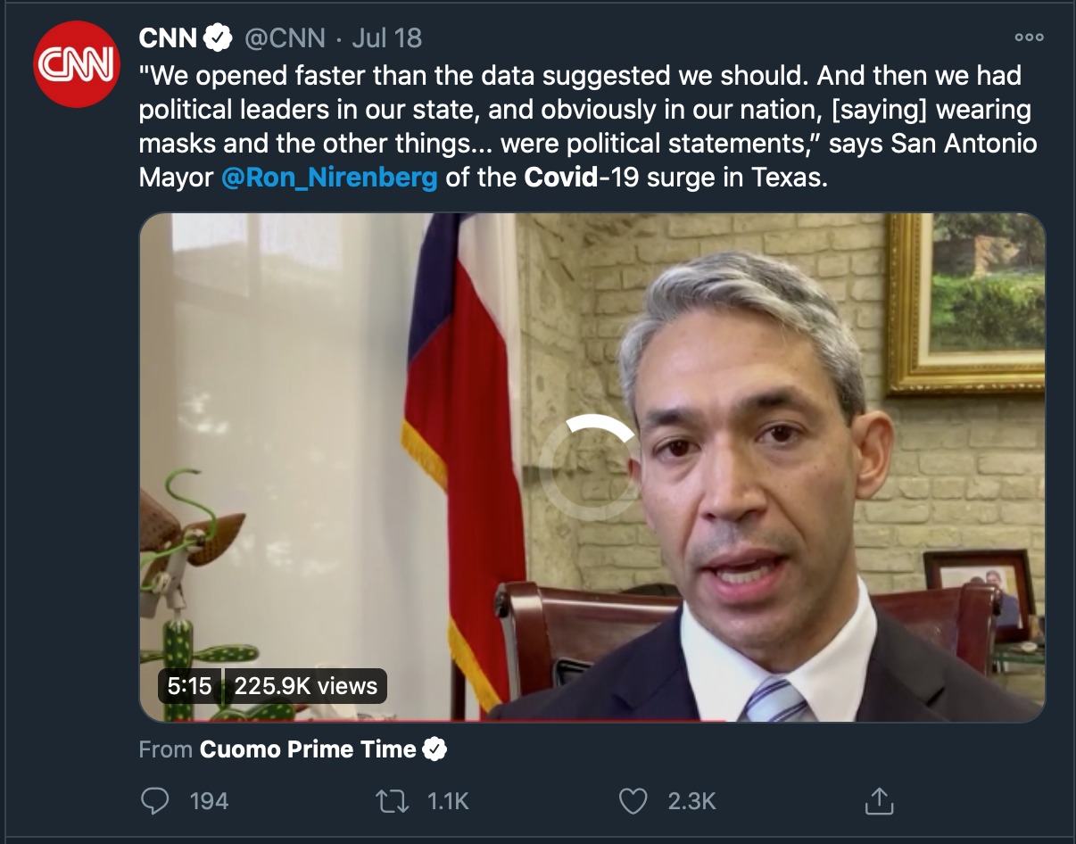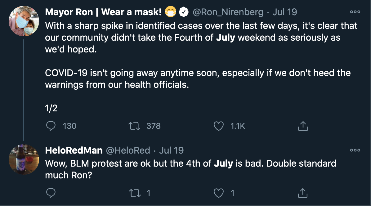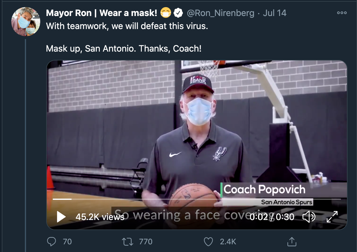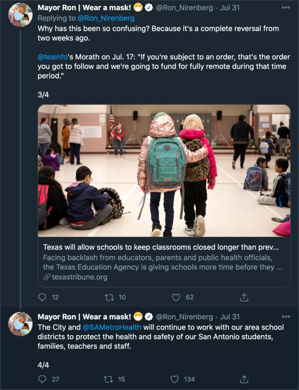 Tweets from San Antonio Mayor Ron Nirenberg throughout July 2020