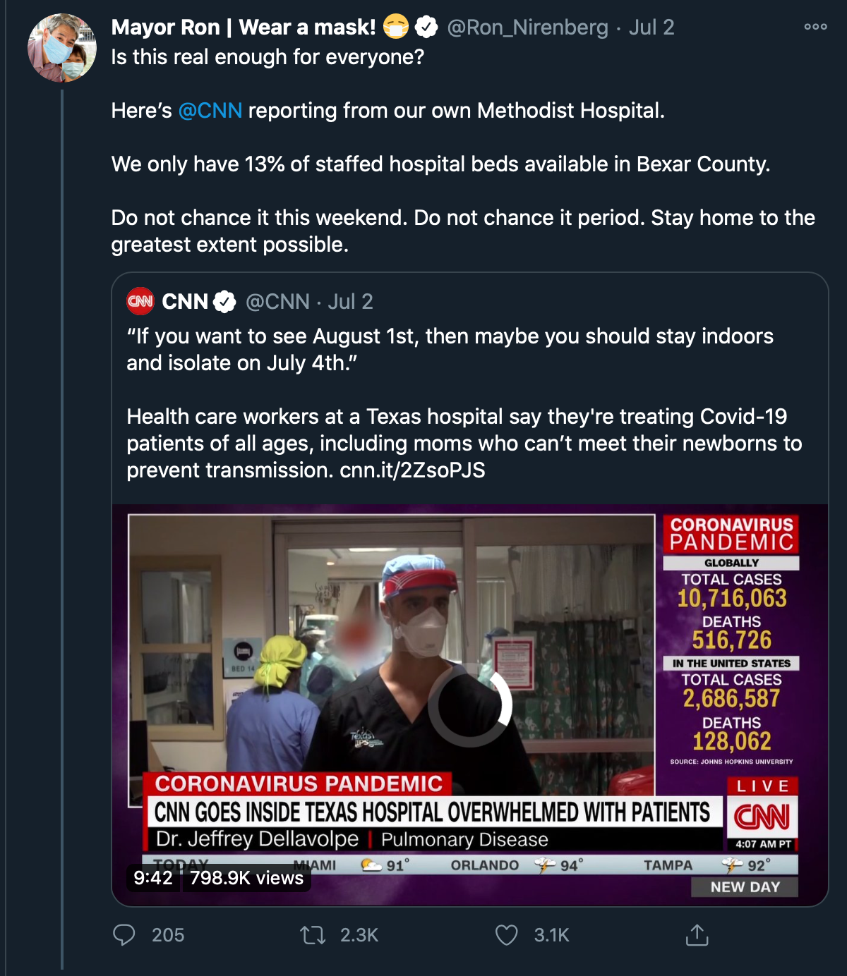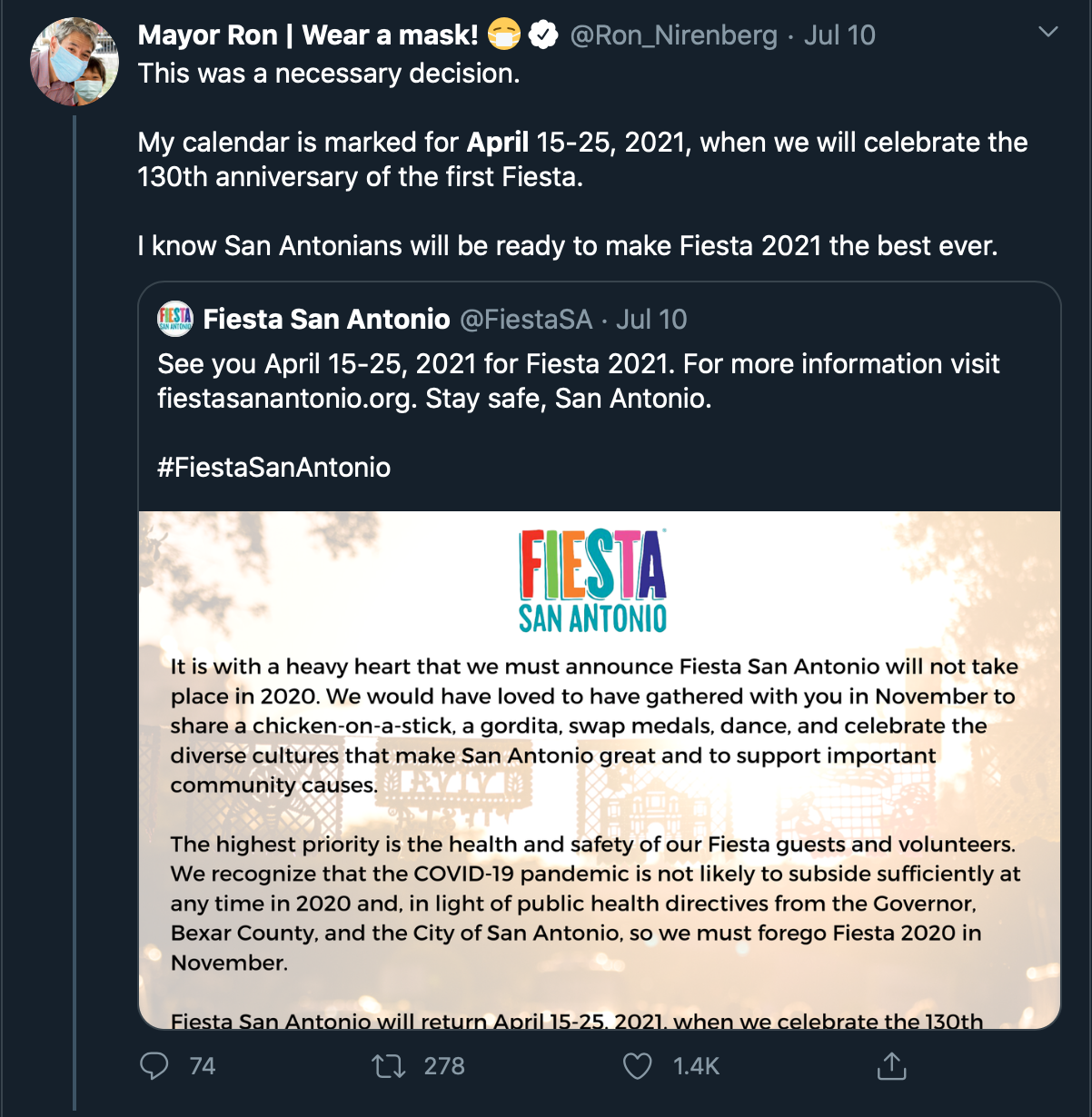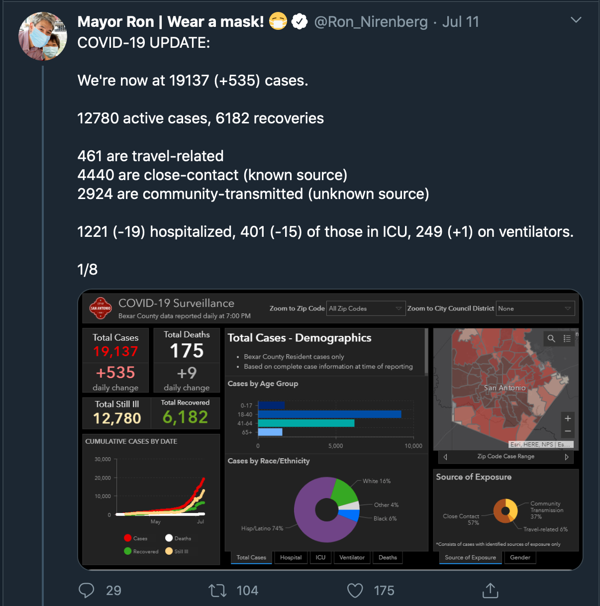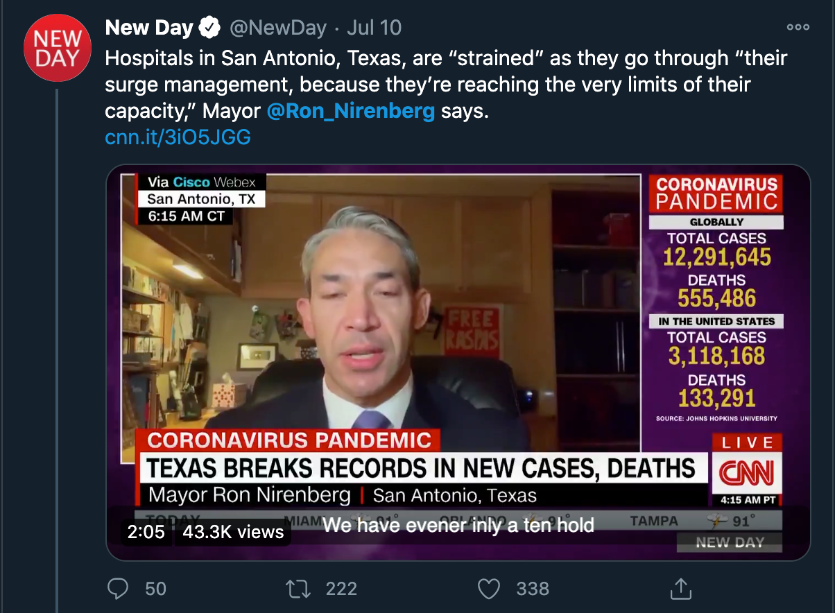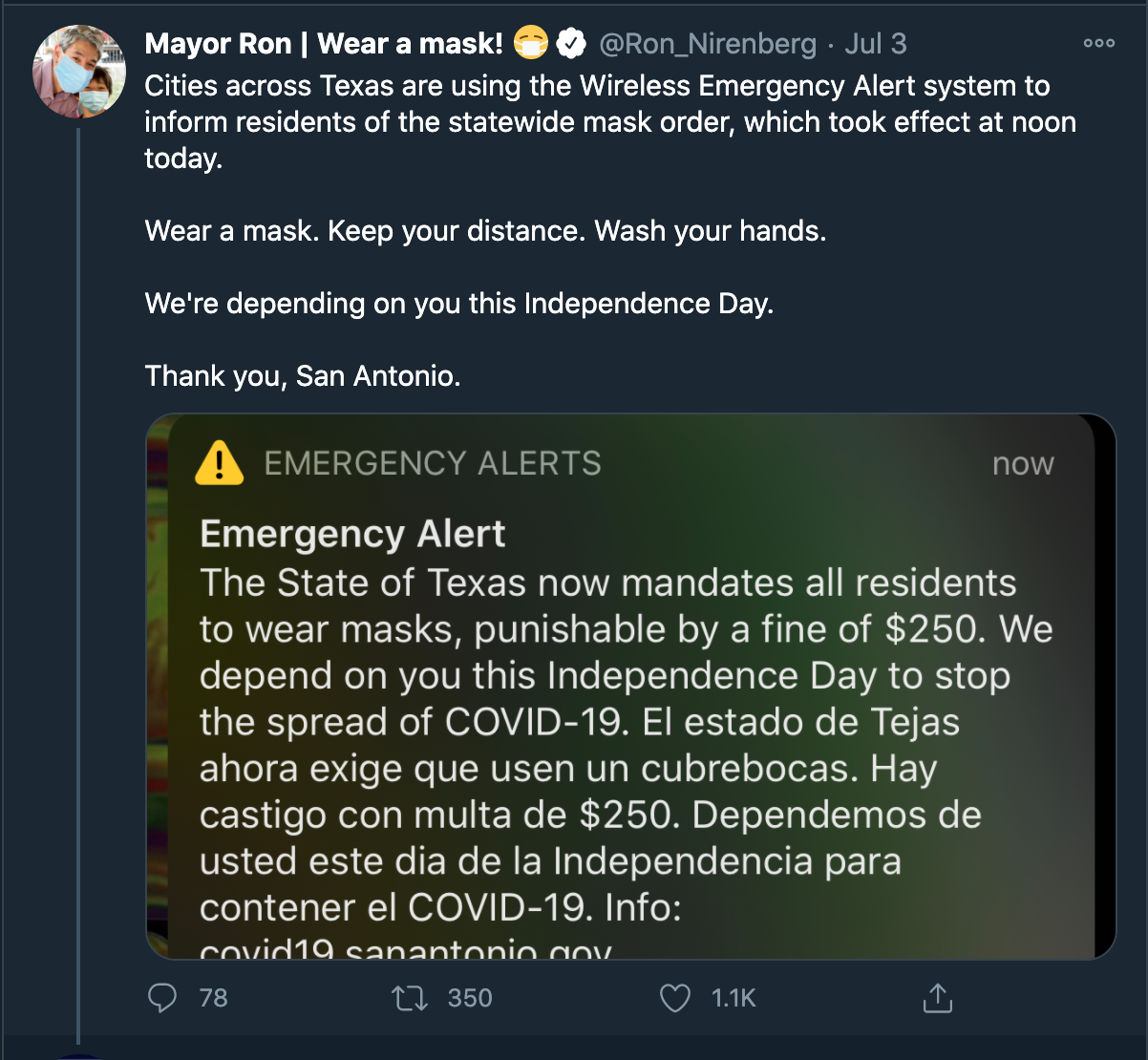 Tweets from San Antonio Mayor Ron Nirenberg throughout July 2020