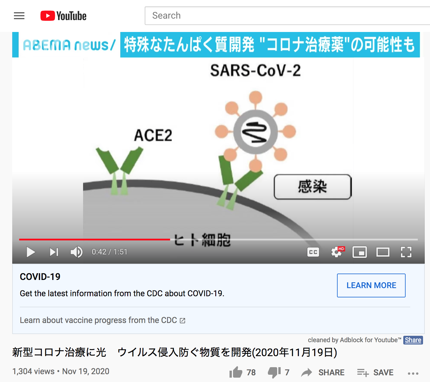 新型コロナ治療に光 ウイルス侵入防ぐ物質を開発(2020年11月19日) - Developed a substance to prevent invasion of light virus for new corona treatment (November 19, 2020)