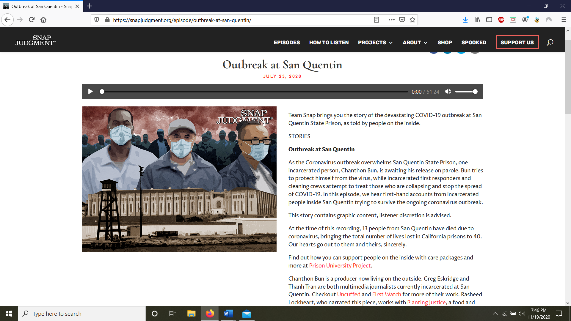 Podcast episode produced by Snap Judgment in which they look at covid-19 outbreaks in San Quentin prison