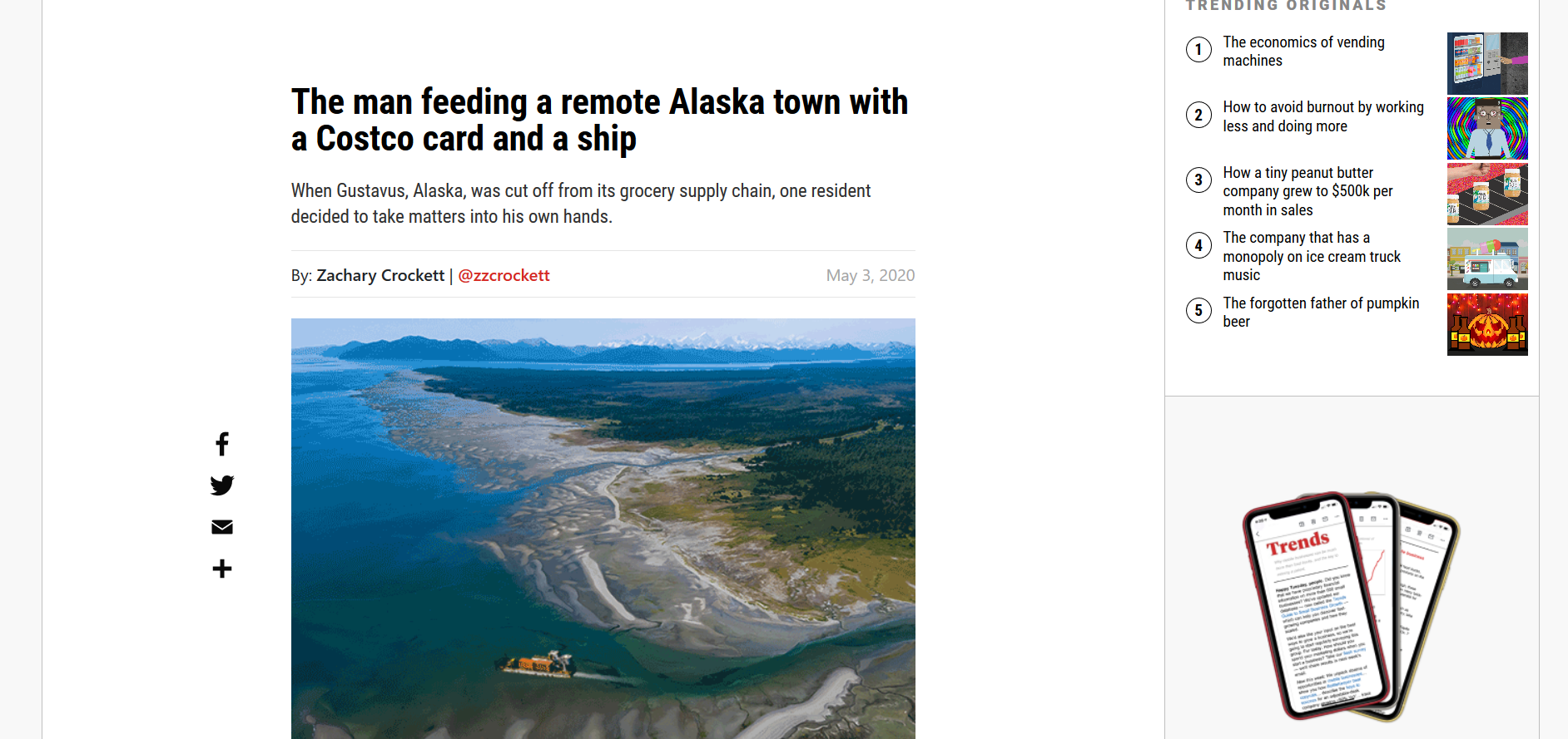 The advent of COVID-19 has made it more difficult for isolated, rural communities to maintain access to basic necessities such as food, water, and personal care products. In an article for the Hustle, journalist Zachary Crokett recounts the story of a Gustavus, Alaska grocer named Toshua Parker, who has taken it upon himself to supply the needs of his fellow townspeople in a time of crisis. Through the use of a shipping freighter, business connections, and a trusty Costco membership card, Parker has mostly succeeded in supplying the community's consumer needs and has made his business, Toshco, an economic pillar of Gustavus.