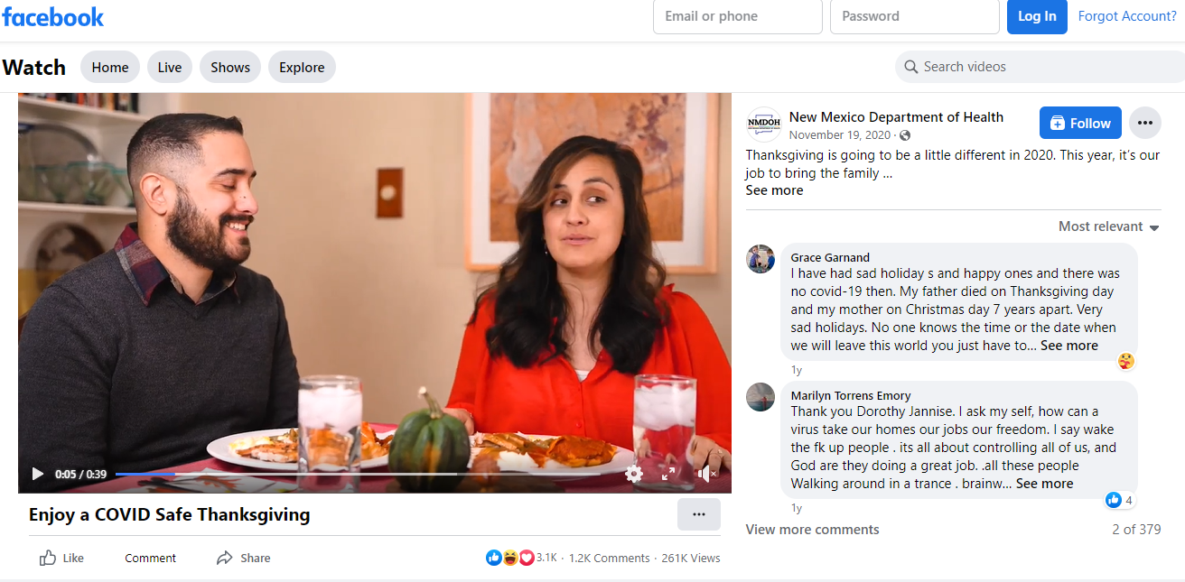The New Mexico Department of Health, created a short video encouraging people not to gather for holidays such as Thanksgiving. It is said that large gatherings increase the odds of transmitting or getting the COVID-19 virus. The video clip shows a family gathered for a traditional Thanksgiving dinner, however they are communicating through their online devices. The conversations have not changed, just they way they interact. Every year my family gathers to enjoy a meal with one another. Holidays will be differnt in 2020, we will not be gathering but we can still speak and interact online.