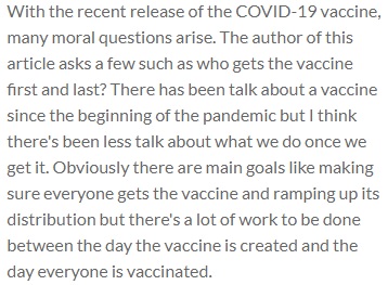 With the recent release of the COVID-19 vaccine, many moral questions arise. The author of this article asks a few such as who gets the vaccine first and last? There has been talk about a vaccine since the beginning of the pandemic but I think there's been less talk about what we do once we get it. Obviously there are main goals like making sure everyone gets the vaccine and ramping up its distribution but there's a lot of work to be done between the day the vaccine is created and the day everyone is vaccinated.