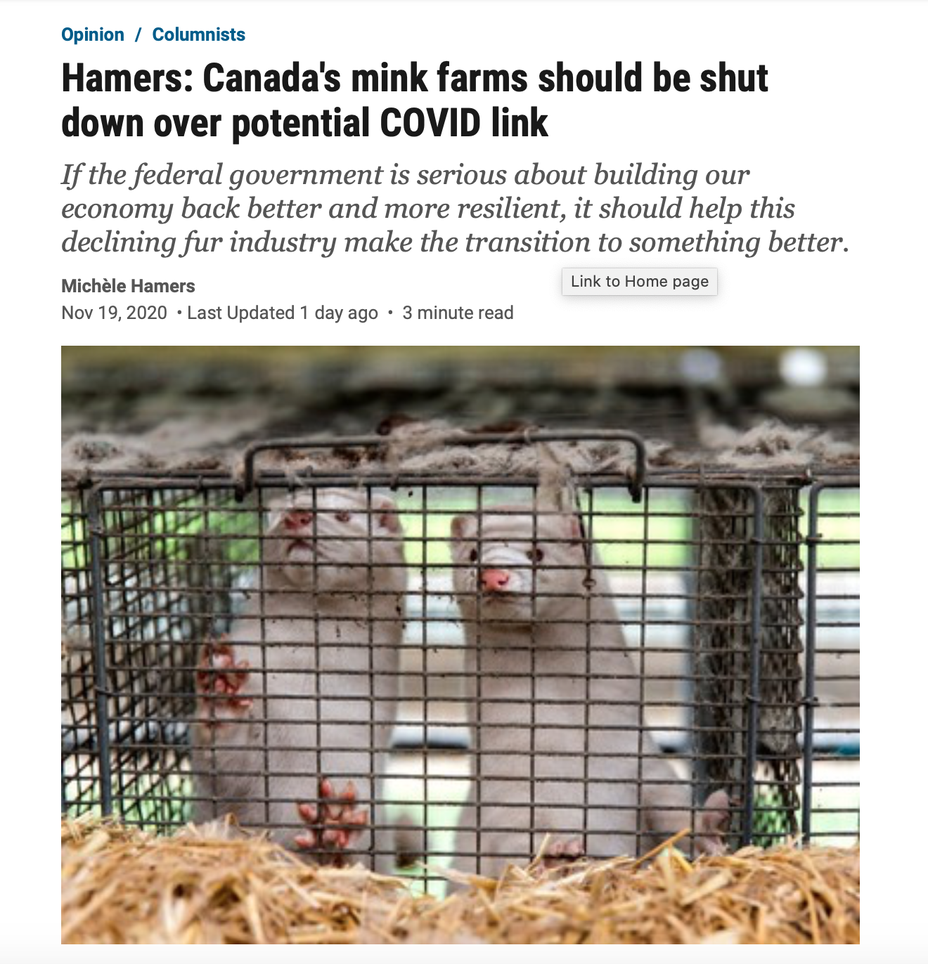 As minks have shown the ability to contract Covid-19, many countries have attempted to cull mink populations. This opinion piece covers the topic of Mink farms in Canada, suggesting that the federal government should take the opportunity to end the practice during the pandemic. This is due to animal rights abuses, decline in the industry, and possible new mutations. Hamer states, "If the Canadian government is serious about building Canada’s economy back better and more resilient, it should help this declining industry transition."