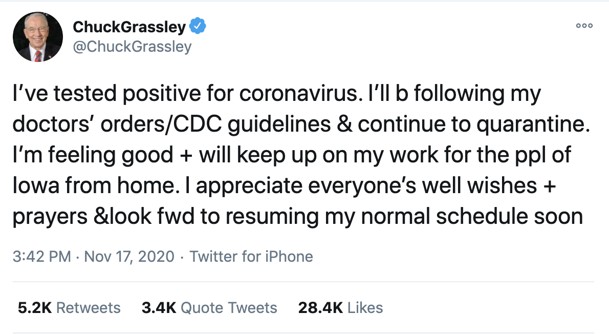 The 87-year-old Iowa senator announced in a tweet this week that he tested positive for COVID-19. There might be another outbreak in GOP lawmakers testing positive as many of them refuse to wear a mask and follow CDC guidelines.