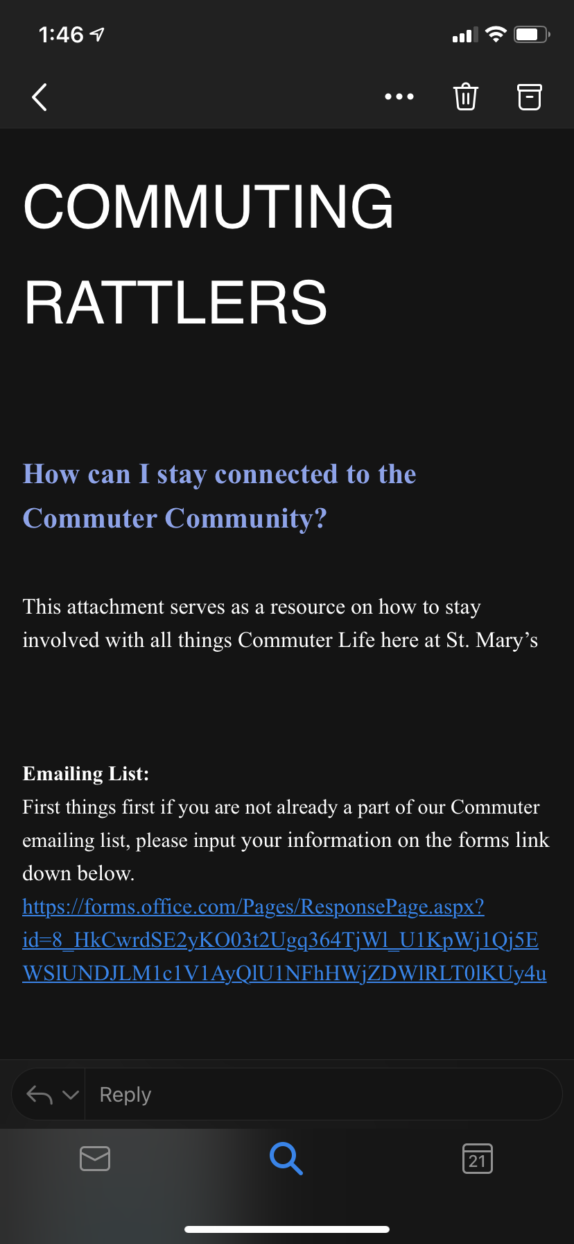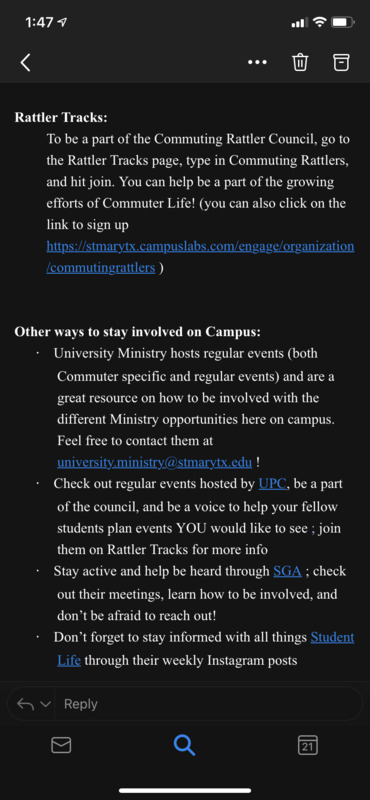 Staying connected as a commuting student has been hard this semester. St. Mary’s University usually holds events quite often for commuters throughout the year but due to covid these events have been put on hold. Recently, St. Mary’s Campus Activities sent out an email on how students can still stay connected in times like this. They have created a Commuting Rattlers GroupMe we can join. This lets us stay linked in with other commuting students and still have a way to interact with each other. We can join the Commuting Rattler Council through our Rattler Tracks. Here we can discuss our Commuting life at St. Mary’s. I feel like these are all great ideas to stay connected. It makes you feel like you are still socializing and being engaged with your community with a whole new twist to it. St. Mary’s also hosts events (Commuter specific and regular events) and are a great chance to stay connected to every aspect the campus has to offer.
