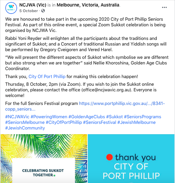 "We are honoured to take part in the upcoming 2020 City of Port Phillip Seniors Festival. As part of this online event, a special Zoom Sukkot celebration is being organised by NCJWA Vic.