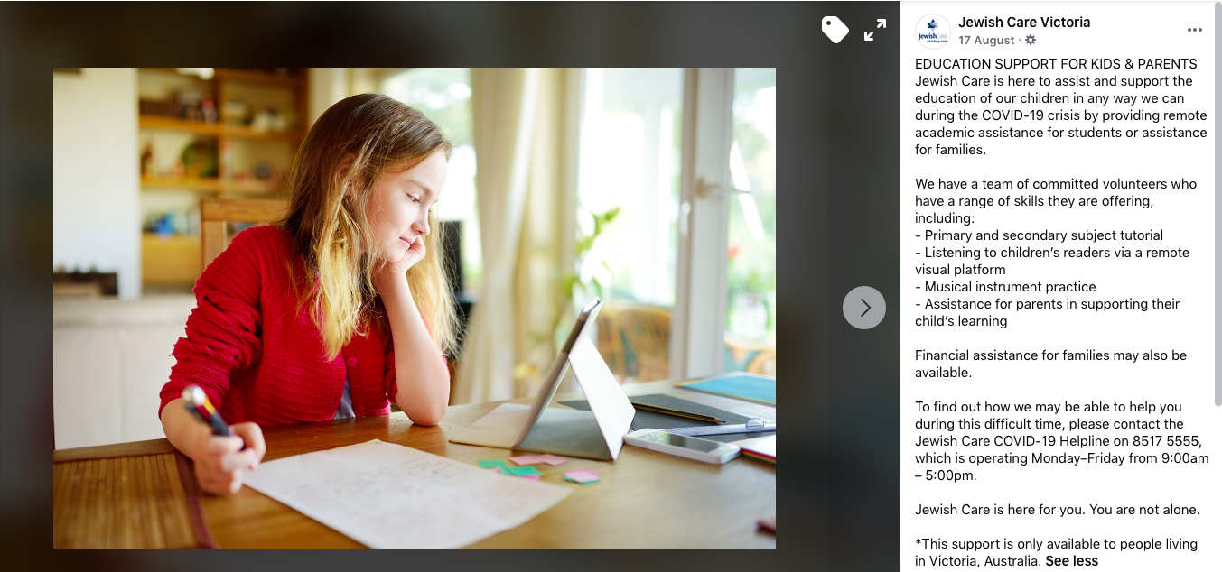 "Jewish Care is here to assist and support the education of our children in any way we can during the COVID-19 crisis by providing remote academic assistance for students or assistance for families.