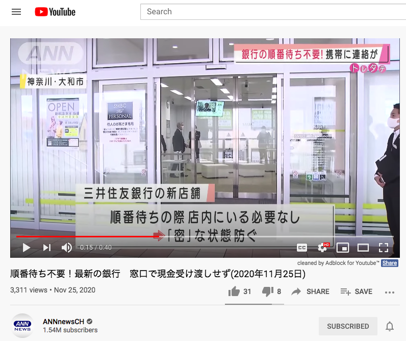 順番待ち不要!最新の銀行 窓口で現金受け渡しせず(2020年11月25日) - No need to wait in line! No delivery of cash at the latest bank counter (November 25, 2020)