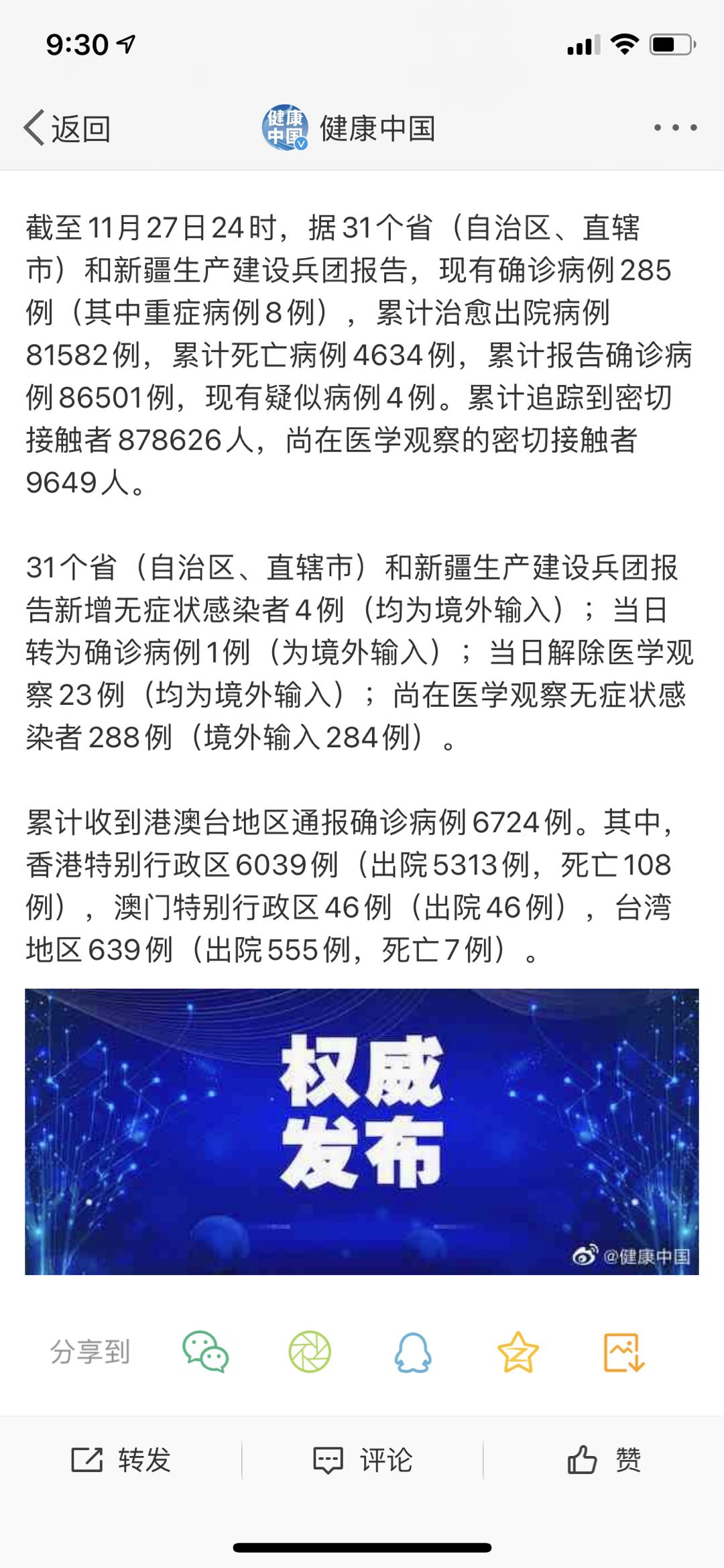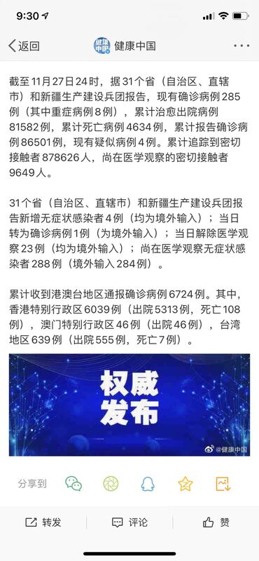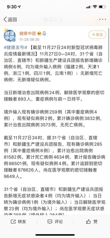 China's daily report on cases of COVID-19. On November 27, the nation had 6 confirmed cases, all are imported cases. No native cases were found on this day. Until this day, there are 285 confirmed cases in the nation that are still in hospitals and receiving treatments.