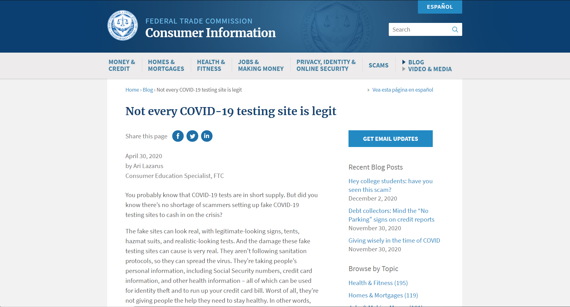 When COVID-19 started to be recognized as a serious problem, the Federal Trade Commission warned of fake COVID-19 testing sites and ways to identify them. Now that the holiday season has started, articles are once again warning of fake testing sites and linking to the FTC's original warning.
