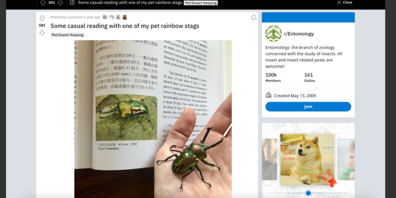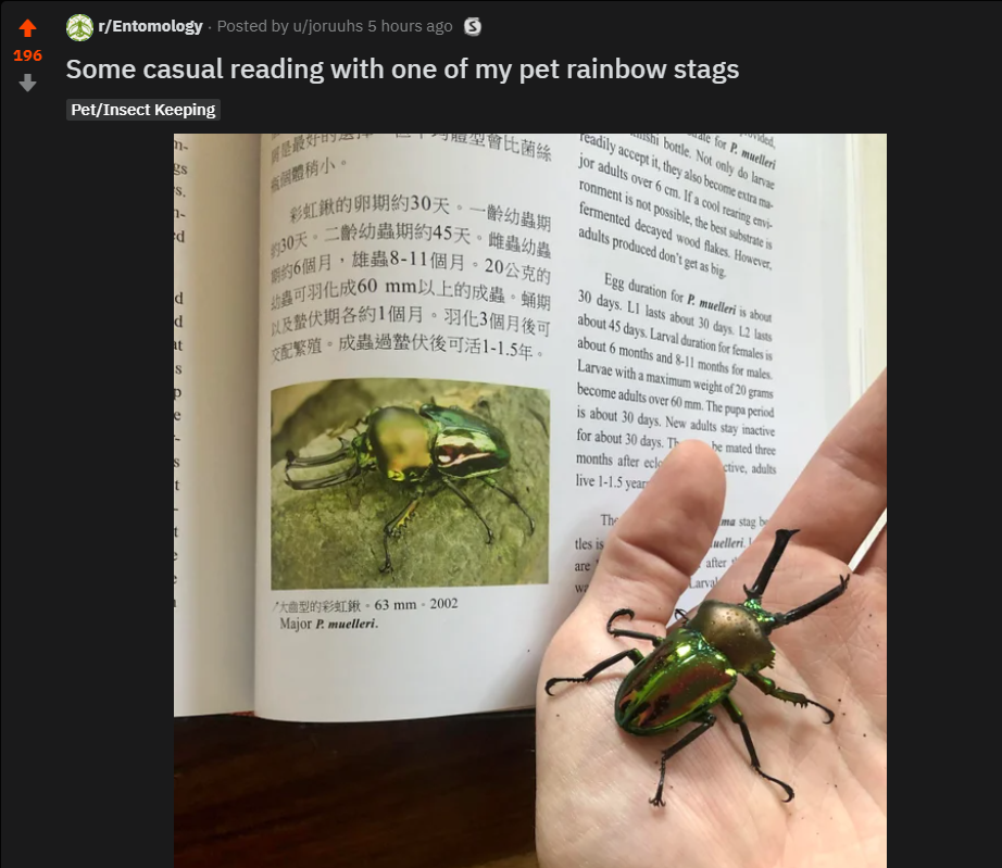 In this pandemic, there has been no shortage of people sharing stories of being in quarantine with their pets and companions, however too saturated are stories of cats and kittens, dogs and puppies, and all those other lovely mammalian companions. Invertebrates truly are unique to raise and care for and this pet owner has their beetle perusing the pages of a Japanese-English encyclopedia on itself.